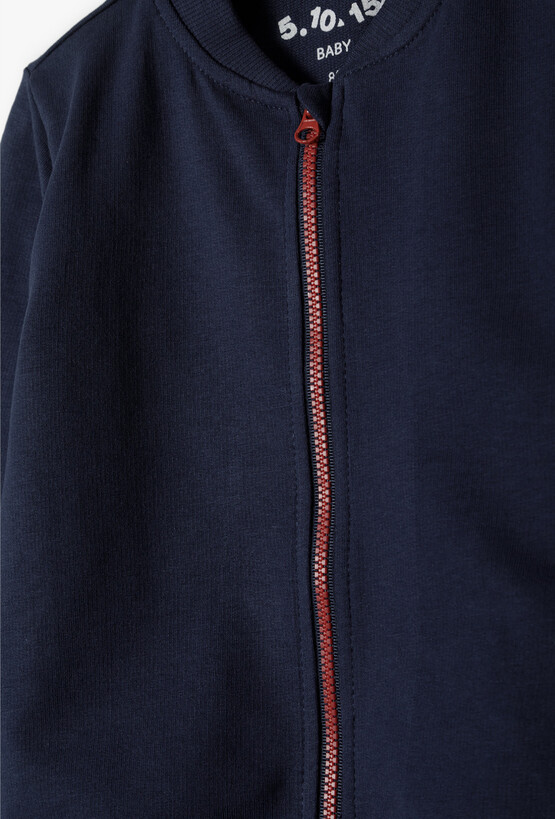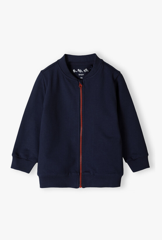 Przygotuj swojego maluszka na każdą przygodę! Ta granatowa bluza o fasonie klasycznej bomberki to niezwykle praktyczny element niemowlęcej garderoby. Łączy w sobie modny, sportowy wygląd z miękkością, która zapewnia dziecku pełną swobodę ruchów podczas zabawy w domu czy drzemki w wózku. Ciemnogranatowy kolor został przełamany wyrazistym, czerwonym zamkiem błyskawicznym. Ten stylowy akcent nadaje bluzie nowoczesnego charakteru i ułatwia szybkie ubieranie oraz rozbieranie maluszka. Klasyczny granat sprawia, że bluza pasuje do niemal wszystkiego – od dresowych spodni po dżinsy. Doskonale prezentuje się w zestawieniu z body w paski lub koszulkami w intensywnych kolorach.