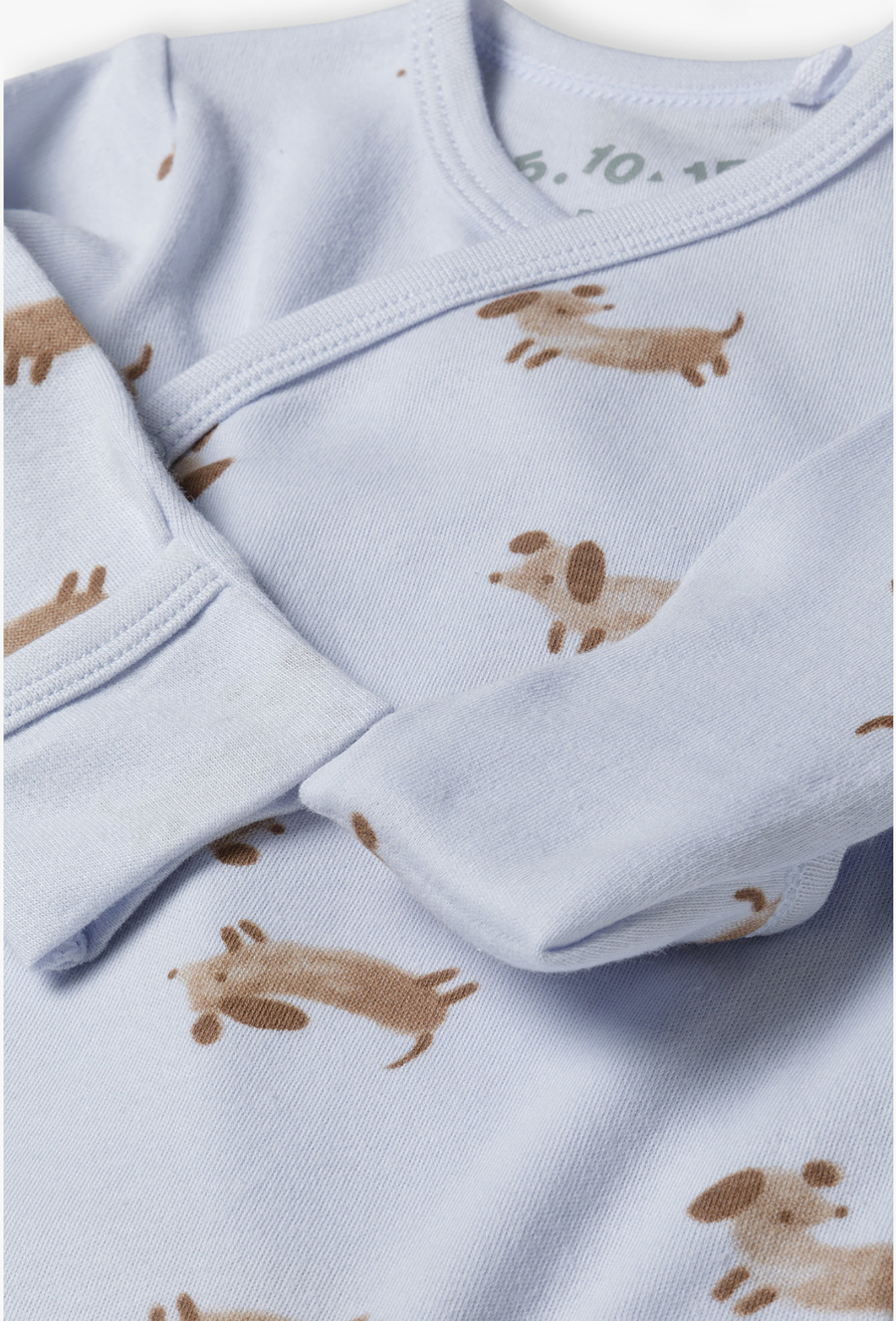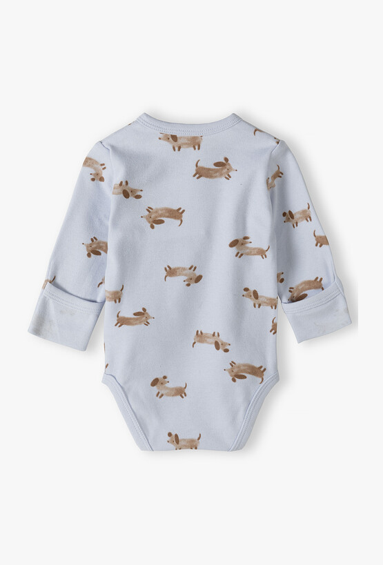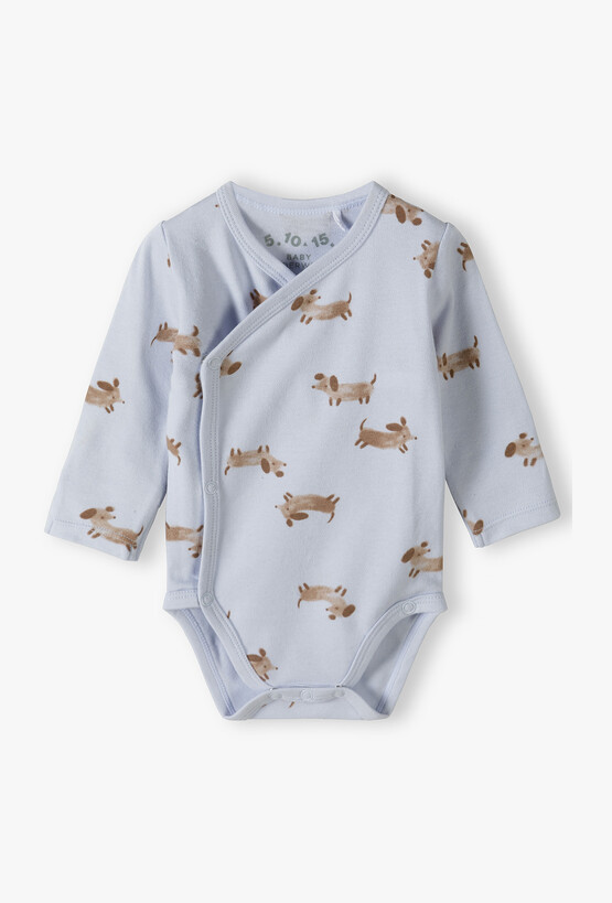 Body kopertowe „Wesołe Jamniki” – najwyższy komfort dla najmłodszych. Zapewnij swojemu maluszkowi to, co najlepsze! To błękitne body z długim rękawem to kwintesencja delikatności i funkcjonalności. Dzięki urokliwemu nadrukowi w pieski oraz przemyślanemu krojowi, ubranko to doskonale sprawdzi się w codziennej opiece nad niemowlęciem, dbając o jego wrażliwą skórę. To najbardziej polecany krój dla noworodków i niemowląt. Body zapinane jest na boku i w kroku na bezpieczne, bezniklowe napy, co eliminuje konieczność przekładania ubranka przez głowę maluszka, czyniąc przebieranie szybkim i bezstresowym. Całe body zdobią grafiki radosnych jamników w odcieniach brązu. Subtelny wzór na jasnobłękitnym tle nadaje ubraniu klasycznego, niemowlęcego wdzięku.