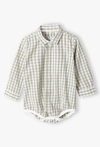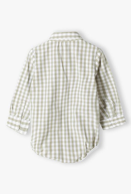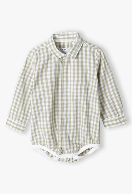 Zadbaj o nienaganny wygląd swojego maluszka podczas ważnych rodzinnych chwil! To body koszulowe łączy w sobie klasyczny styl męskiej koszuli z funkcjonalnością i wygodą tradycyjnego body. Dzięki subtelnej kolorystyce i naturalnym materiałom, Twój synek będzie prezentował się stylowo, nie tracąc przy tym pełnej swobody ruchów. Wzór drobnej kratki w odcieniu stonowanej oliwki i bieli nadaje ubranku szlachetnego, rustykalnego charakteru. To fason, który nigdy nie wychodzi z mody. Body świetnie komponuje się z beżowymi spodniami typu chino, granatowym kardiganem lub eleganckimi szelkami. To baza, która sprawdzi się na chrzcinach, urodzinach czy sesjach fotograficznych.
