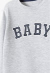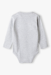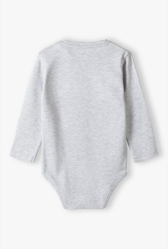 Zapewnij swojemu maluszkowi wygodę i styl od pierwszych dni życia! To szare body z długim rękawem to absolutny „must-have” w szafie każdego niemowlaka. Łączy w sobie uniwersalny, melanżowy odcień z modnym nadrukiem, tworząc idealną bazę do codziennych stylizacji – zarówno pod bluzę, jak i jako samodzielne ubranko. Przód ubranka zdobi duży, napis „BABY” w białej obwódce. Stylistyka nawiązująca do amerykańskich bluz uniwersyteckich nadaje bodziakowi nowoczesnego i radosnego charakteru. Jasnoszary melanż świetnie komponuje się z granatową bomberką, błękitnymi spodniami dresowymi czy klasycznym kardiganem. Trzy solidne napy w dolnej części pozwalają na szybką i sprawną zmianę pieluszki bez konieczności zdejmowania całego body.