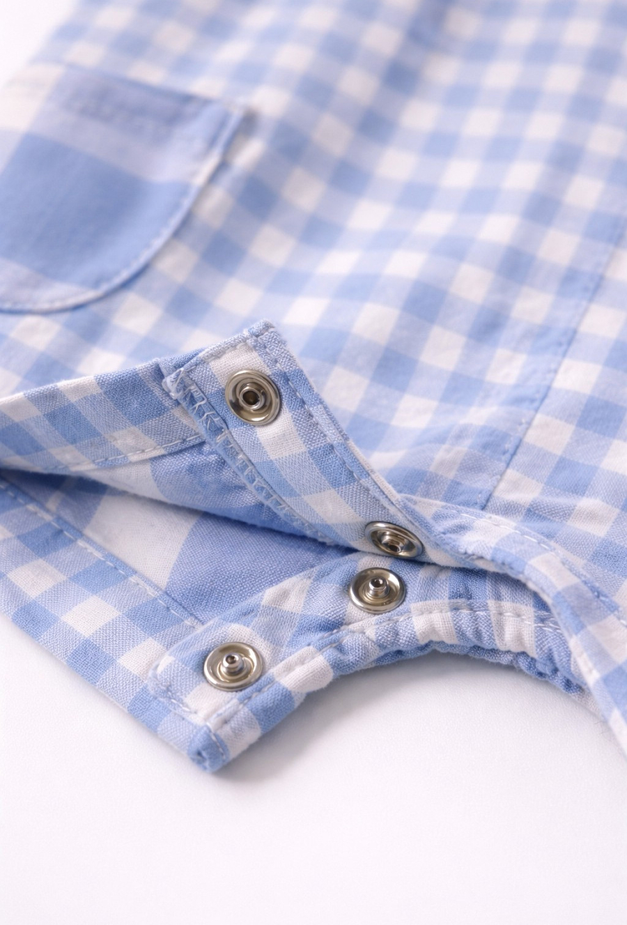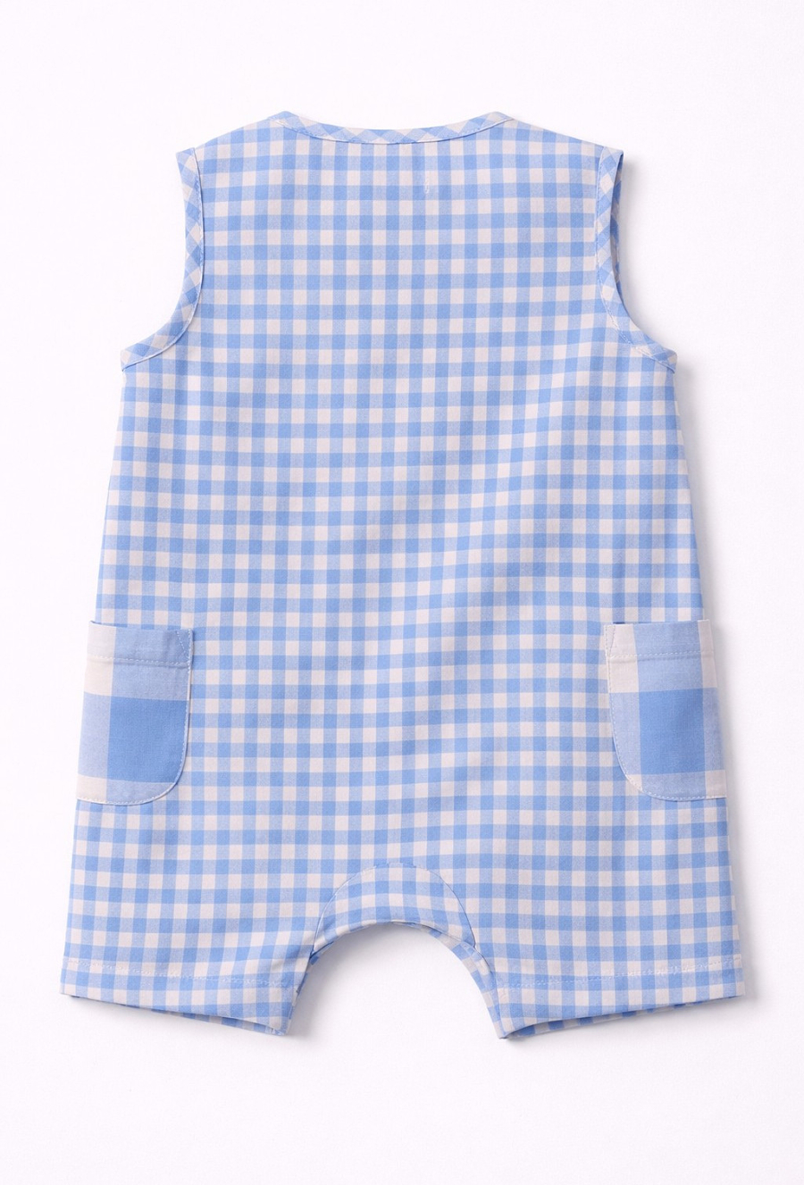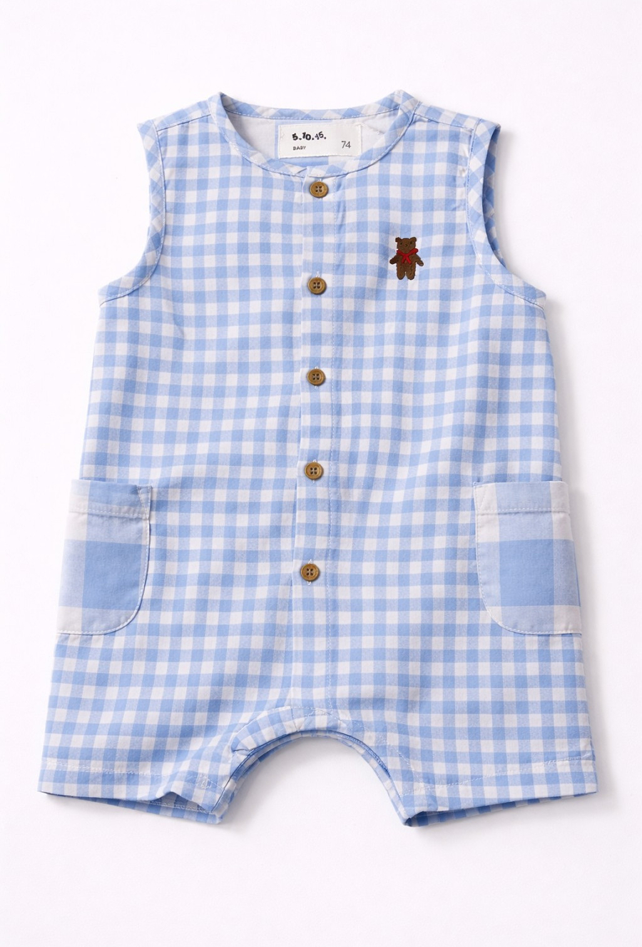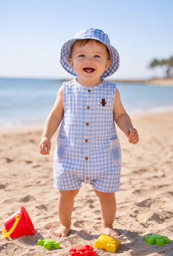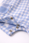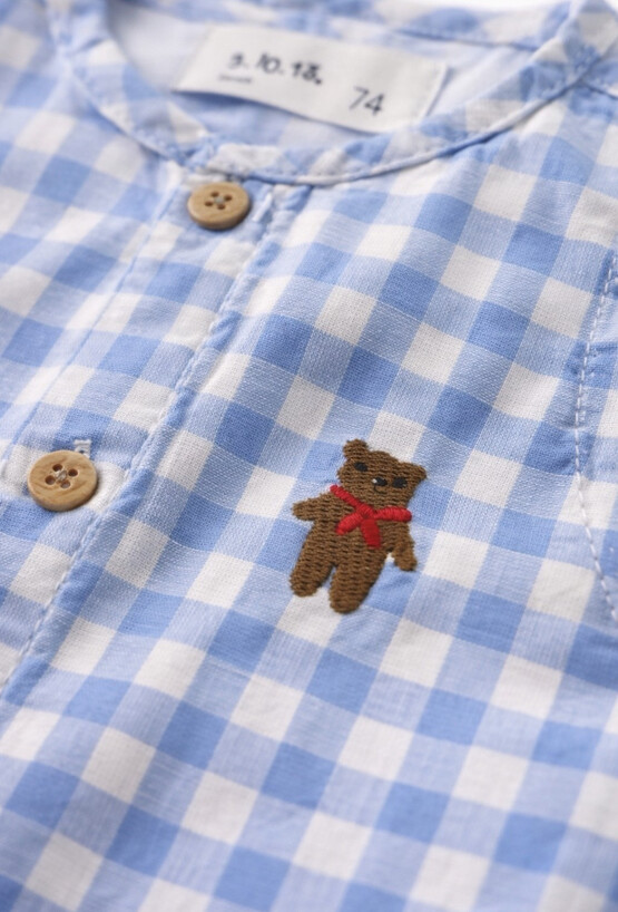 Krótki pajac niemowlęcy dla chłopca wykonany z miękkiego, przewiewnego muślinu bawełnianego. Materiał tkany w klasyczną niebieską kratkę nadaje całości ponadczasowego charakteru i sprawia, że model świetnie prezentuje się zarówno na co dzień, jak i na wyjątkowe okazje. Na froncie znajduje się ozdobna naszywka z misiem, która dodaje ubranku dziecięcego uroku. Pajac zapinany jest na guziki z przodu, a napy w kroku ułatwiają szybkie przebieranie. Po bokach umieszczono praktyczne kieszenie, które podkreślają casualowy styl modelu. Idealny wybór na ciepłe dni – wygodny, funkcjonalny i estetycznie dopracowany.