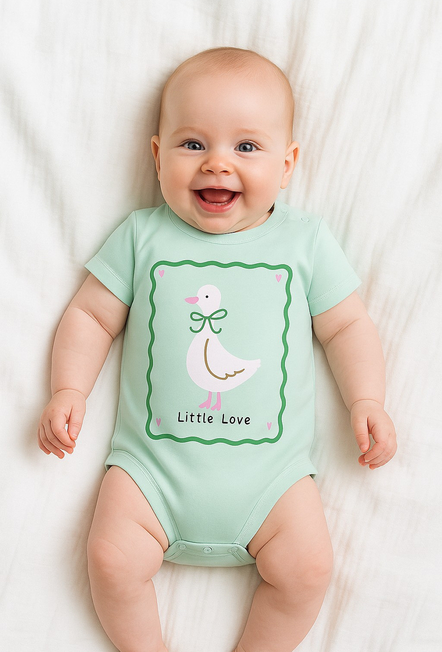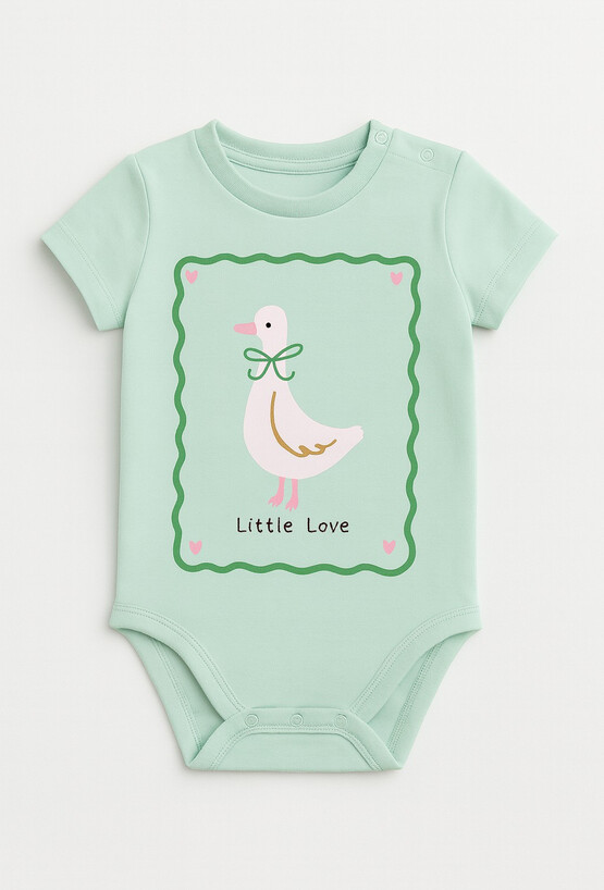 Zielone body niemowlęce z krótkim rękawem wykonane z bawełny z dodatkiem elastanu to wygodna propozycja na co dzień. Elastyczny materiał zapewnia swobodę ruchów oraz komfort przez cały dzień. Model ozdobiony jest nadrukiem kaczki umieszczonym na środku, który nadaje body radosnego, dziecięcego charakteru. Miękka tkanina jest przyjemna w dotyku i bezpieczna dla wrażliwej skóry niemowlęcia.