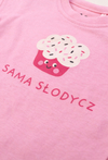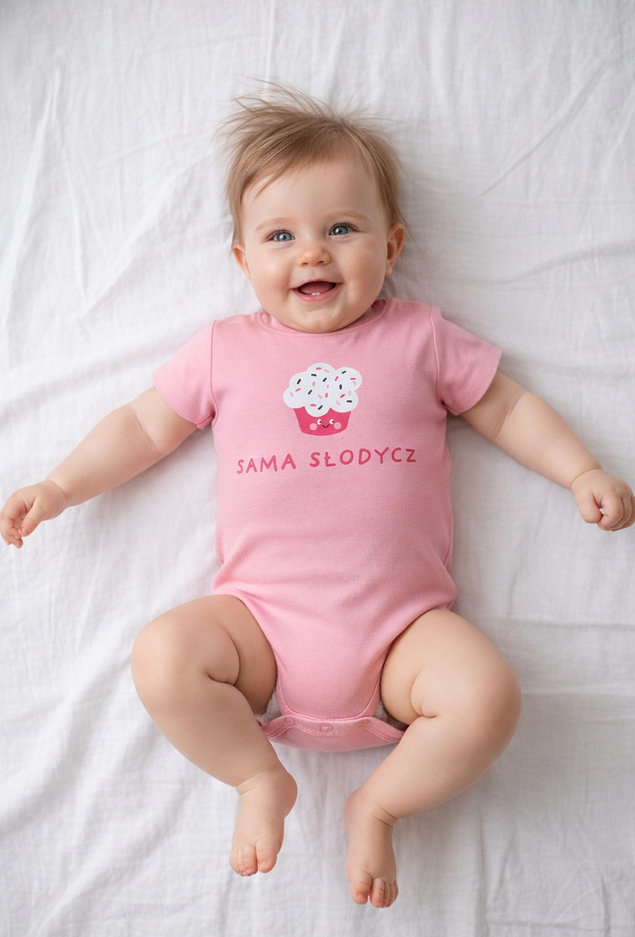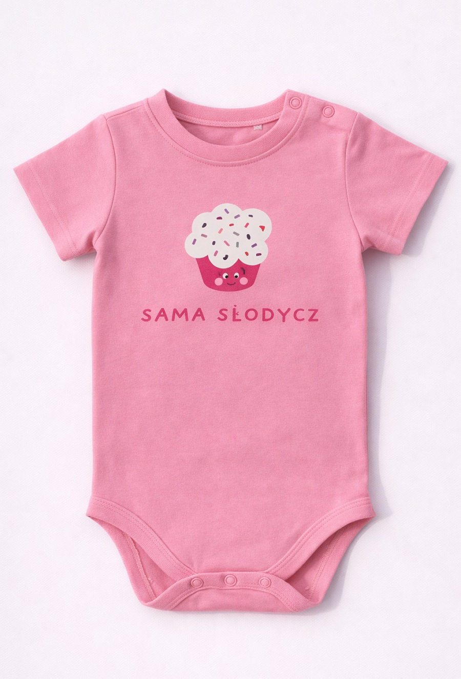 Urocze body niemowlęce z krótkim rękawem dla dziewczynki, które łączy wygodę z dziewczęcym urokiem. Model ozdobiony jest kolorowym motywem babeczki oraz napisem „Sama Słodycz”, który dodaje całości radosnego charakteru. Praktyczne napy ułatwiają zakładanie oraz szybkie przewijanie, co doceni każdy rodzic. Klasyczny krój i krótki rękaw sprawiają, że body świetnie sprawdzi się zarówno latem, jak i jako baza pod inne elementy garderoby. To idealny wybór na co dzień, na prezent lub jako część pierwszej wyprawki dla niemowlaka.