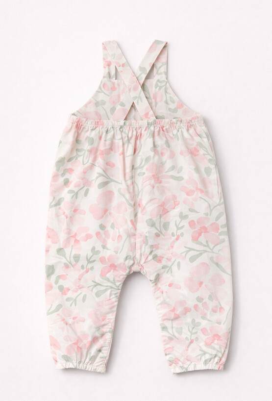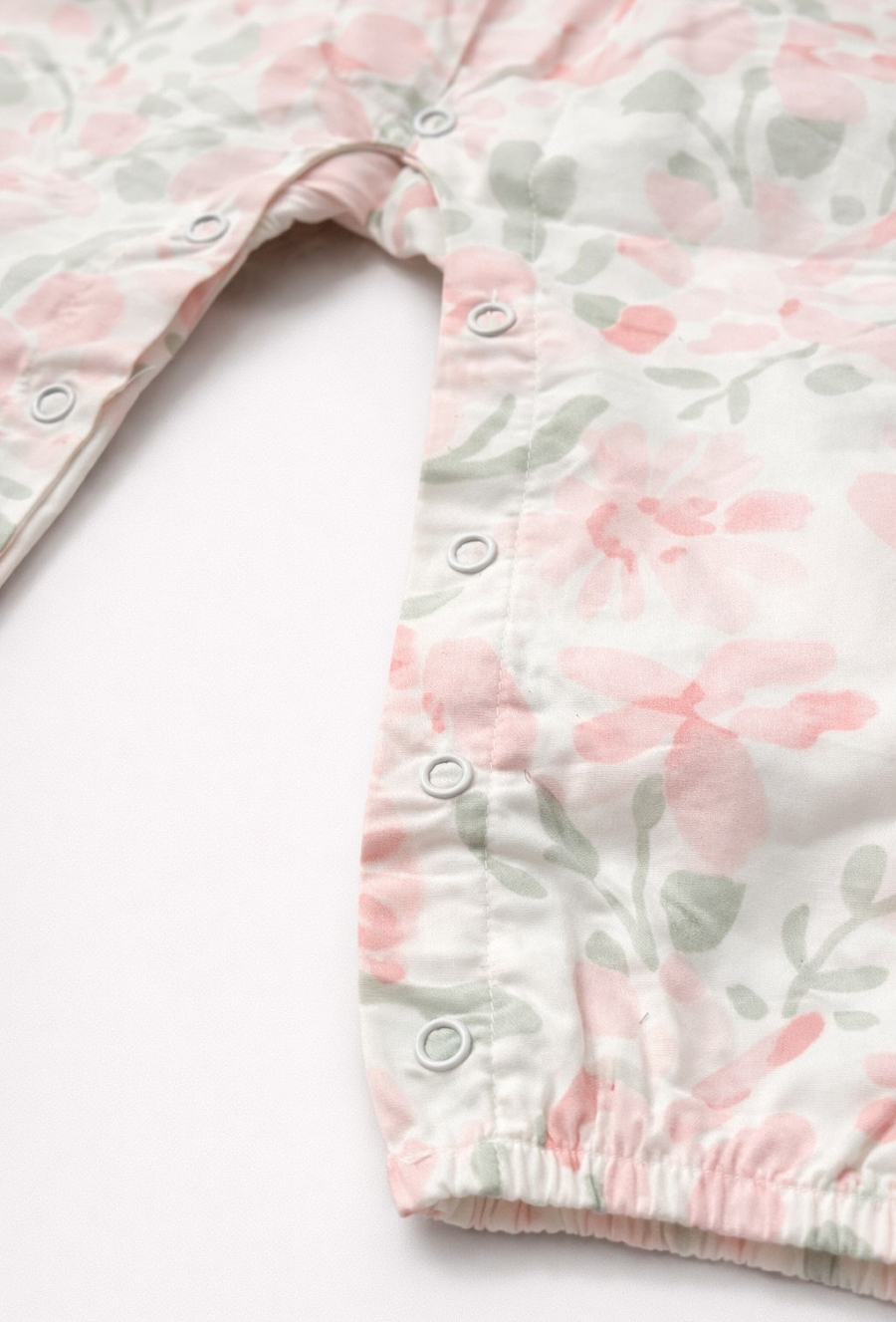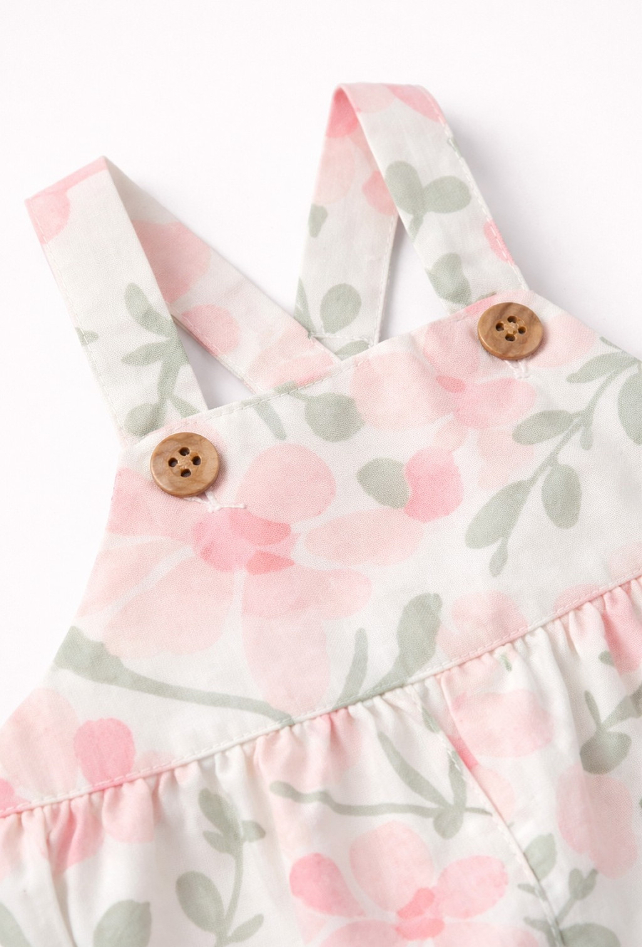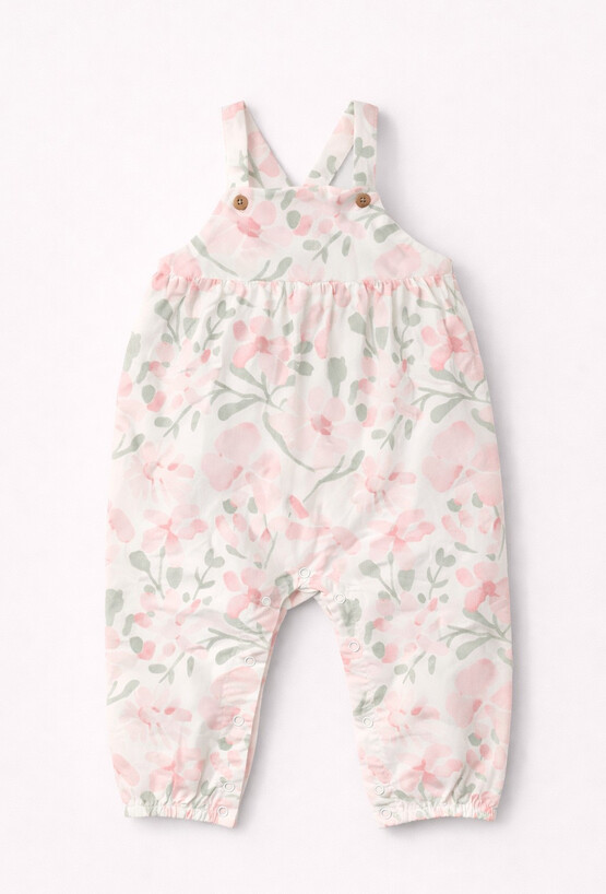 Ten uroczy pajac w kolorze ecru to idealne połączenie wygody i delikatnego designu dla najmłodszych. Został zaprojektowany z myślą o pełnym komforcie dziecka, oferując swobodny krój, który nie krępuje ruchów podczas odpoczynku czy zabawy. Głównym atutem modelu jest subtelny, kolorowy nadruk w kwiaty w odcieniach różu, który nadaje ubranku wyjątkowo radosnego charakteru. Pajac posiada przemyślane rozwiązania ułatwiające codzienne pielęgnowanie niemowlęcia: u góry znajdują się estetyczne zapięcia na guziki przy ramiączkach, natomiast w kroku oraz wzdłuż nogawek zastosowano praktyczne napy, które znacząco przyspieszają przewijanie. Nogawki wykończone są delikatną gumką, co sprawia, że ubranko dobrze trzyma się na miejscu.