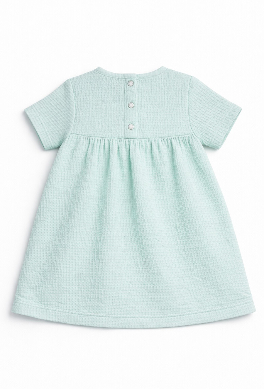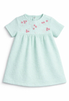 Zielona sukienka niemowlęca z krótkim rękawem wykonana z bawełny z dodatkiem elastanu to połączenie wygody i subtelnej elegancji. Strukturalny materiał żakardowy jest bardzo elastyczny, miękki i przyjemny w dotyku, dzięki czemu zapewnia komfort noszenia oraz swobodę ruchów. Górną część sukienki zdobią delikatne hafty w kwiatki, które nadają całości dziewczęcego i lekkiego charakteru. Model posiada zapięcie na napy z tyłu, ułatwiające ubieranie i zdejmowanie. Lekko rozkloszowany dół sprawia, że sukienka doskonale sprawdzi się zarówno na co dzień, jak i na wyjątkowe okazje.