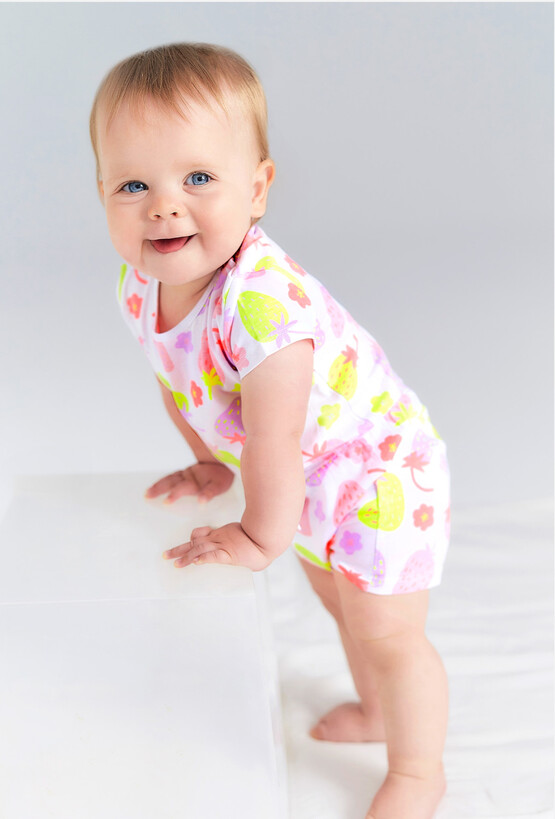 Przygotuj swoją córeczkę na słoneczne dni w najbardziej uroczy sposób! Ten krótki pajac, zwany rampersami, to idealne rozwiązanie na lato – łączy w sobie wygodę jednoczęściowego ubranka z przewiewnością krótkich rękawków i nogawek. Intensywny, radosny wzór sprawi, że Twoje dziecko będzie wyglądać wyjątkowo podczas każdego spaceru. Całe ubranko pokryte jest gęstym nadrukiem soczystych truskawek w odcieniach różu, czerwieni i neonowej zieleni. To wzór, który emanuje pozytywną energią i idealnie pasuje do letniej aury. Krótki fason z elastycznymi wykończeniami nogawek zapewnia dziecku nieograniczoną swobodę podczas kopania nóżkami, raczkowania czy stawiania pierwszych kroków.