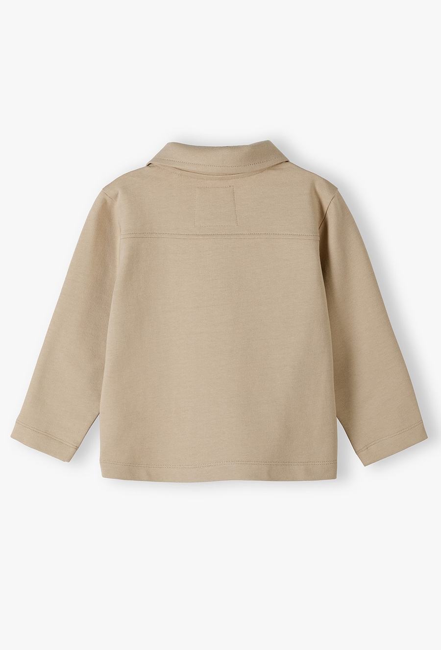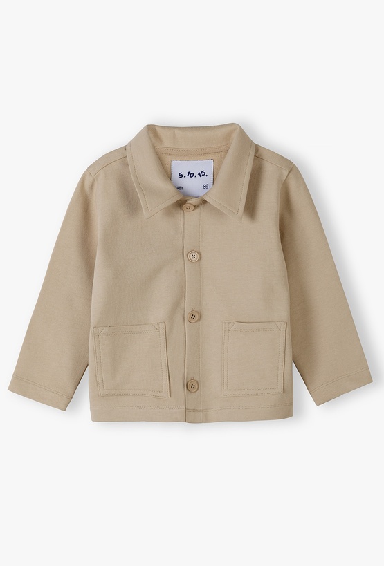 Szukasz ubranka, które łączy w sobie swobodę bluzy z eleganckim wyglądem kurtki? Ta beżowa bluza o fasonie kurtki koszulowej to doskonały wybór dla małego odkrywcy. Dzięki uniwersalnej kolorystyce i dopracowanym detalom, sprawdzi się zarówno podczas codziennych spacerów, jak i rodzinnych uroczystości. Połączenie koszuli i kurtki to jeden z najgorętszych trendów. Bluza posiada klasyczny kołnierzyk, który nadaje dziecku schludny wygląd, zachowując przy tym pełen komfort noszenia dzianiny. Przód bluzy zdobią cztery estetyczne guziki w kolorze dopasowanym do materiału. Ułatwiają one sprawne ubieranie i rozbieranie maluszka, a jednocześnie stanowią elegancki akcent dekoracyjny. Ciepły, piaskowy odcień beżu to doskonała baza – świetnie komponuje się z niebieskimi jeansami, białymi body czy błękitnym kardiganem.