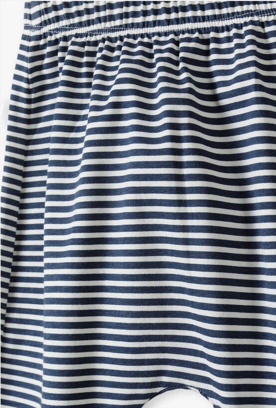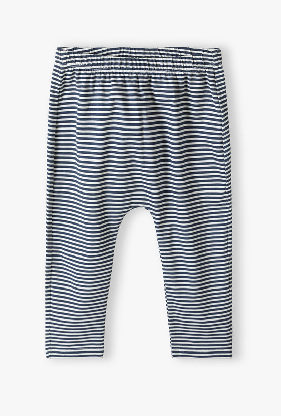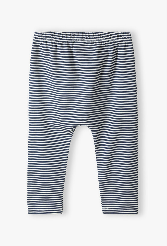 Klasyka spotyka się z funkcjonalnością! Te spodnie dresowe w granatowo-białe paski to idealny wybór dla maluszka, który potrzebuje pełnej swobody podczas codziennych aktywności. Dzięki luźniejszemu fasonowi i miękkiej dzianinie, spodnie zapewniają komfort przez cały dzień, bez względu na to, czy dziecko bawi się, czy odpoczywa. Poziome, granatowe pasy na białym tle to wzór, który nigdy nie wychodzi z mody. Nadaje on ubraniu świeżego, letniego charakteru i pasuje do wielu gładkich body oraz koszulek. Fason dresów został zaprojektowany tak, aby bez trudu mieścić pieluszkę i zapewniać odpowiednią ilość miejsca w kroku. Luźniejsze nogawki gwarantują swobodę ruchów nóżek.