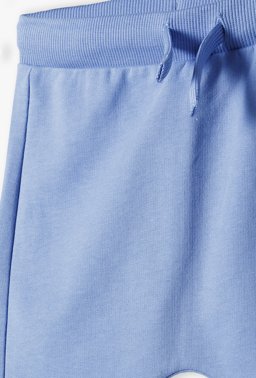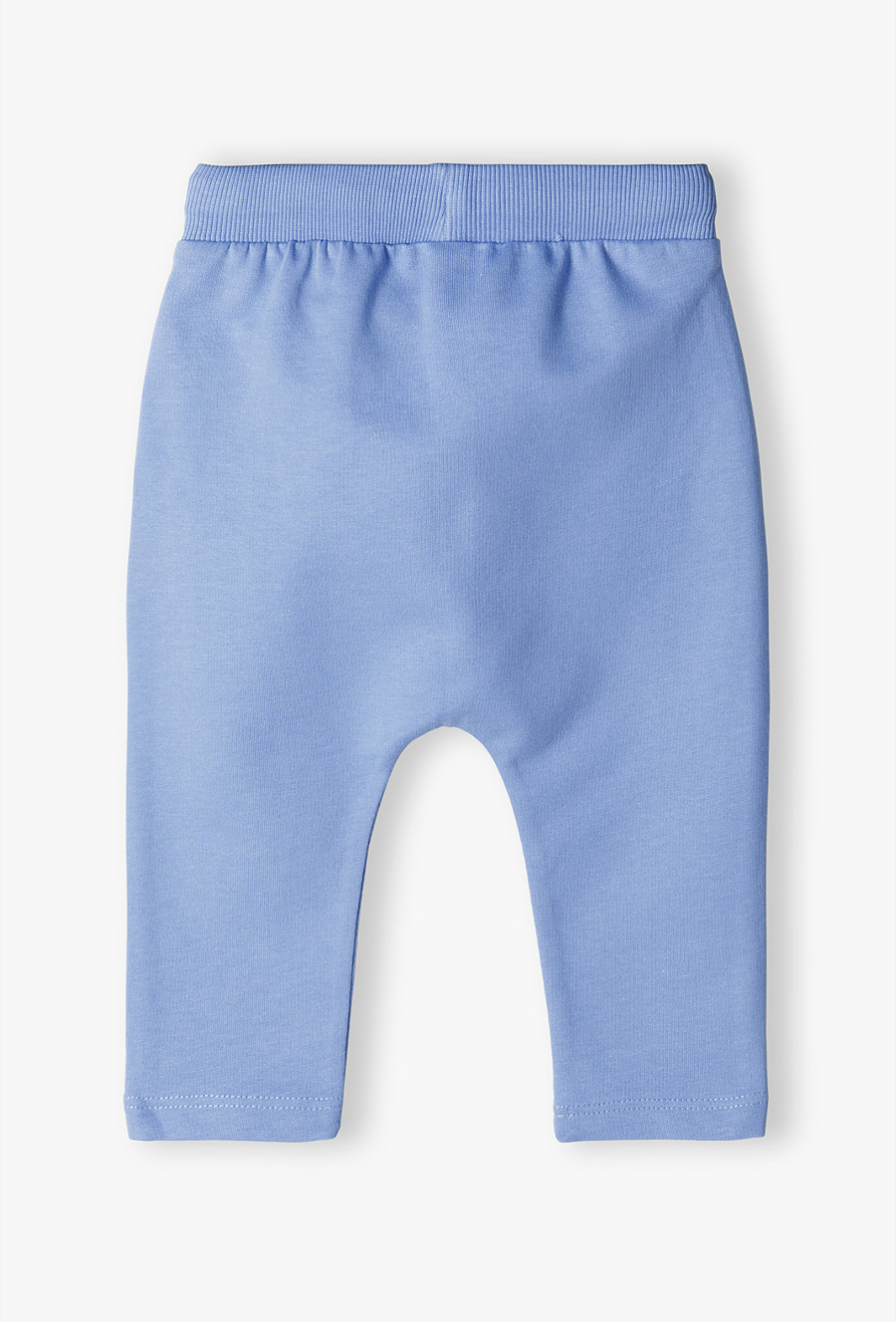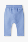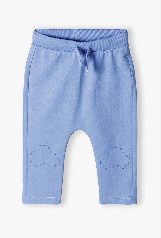Zapewnij swojemu dziecku maksymalną swobodę ruchów podczas codziennych odkryć! Te błękitne spodnie dresowe to idealne połączenie funkcjonalności i uroczego designu. Miękki materiał i przemyślany krój sprawiają, że są one niezastąpionym elementem niemowlęcej garderoby, idealnym do drzemek, raczkowania i radosnych zabaw. Na kolanach umieszczono subtelne, wykonane ściegiem przeszycia w kształcie konturów samochodzików. To stylowy detal, który nadaje spodniom unikalnego charakteru. Nogawki zakończone są elastycznymi ściągaczami, dzięki czemu spodnie nie podwijają się i zawsze pozostają na swoim miejscu, chroniąc nóżki przed chłodem. Spodnie świetnie komponują się z granatową bluzą oraz bawełnianym kardiganem, tworząc komfortowy zestaw na spacer.