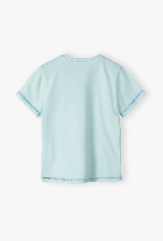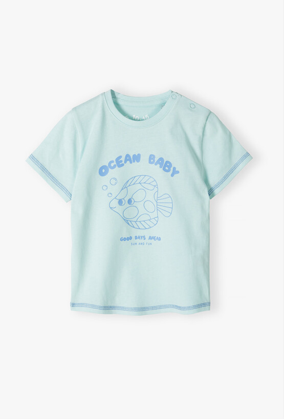 Koszulka „Ocean Baby” – radosny styl dla Twojego małego odkrywcy. Podaruj swojemu dziecku komfort i uroczy wygląd w upalne dni! Ten błękitny T-shirt z krótkim rękawem to idealne połączenie delikatności, funkcjonalności i wakacyjnego designu, który przyciąga wzrok. Centralną część koszulki zdobi duży, błękitny nadruk uśmiechniętej rybki w kropki oraz radosne napisy „Ocean Baby” i „Good days ahead – Sun and Fun”. To idealna stylizacja na wakacyjne przygody. Na lewym ramieniu znajdują się praktyczne zapięcia na napy. Dzięki temu rozwiązaniu przekładanie koszulki przez główkę niemowlęcia jest szybkie, bezstresowe i bardzo wygodne dla rodzica.
