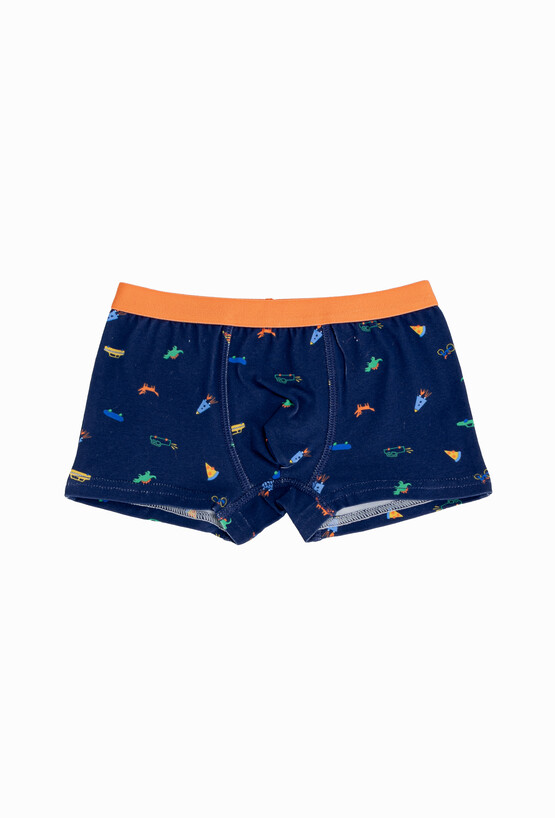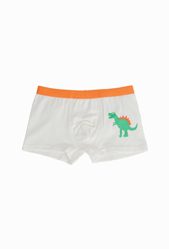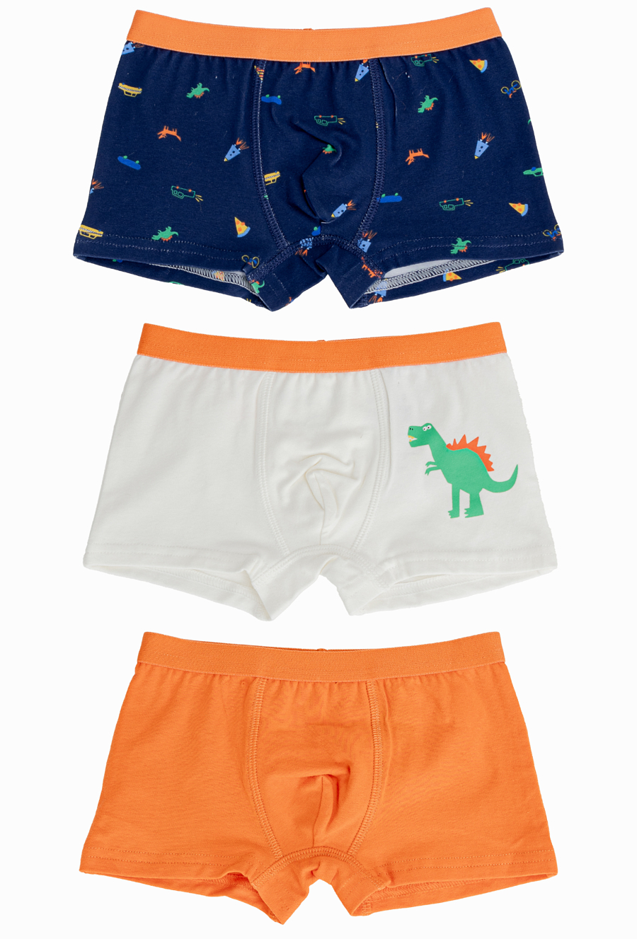 Zestaw trzech wygodnych i elastycznych bokserek chłopięcych w różnorodnych kolorach i wzorach. Wykonane z miękkiej bawełny z dodatkiem elastanu – idealnie dopasowują się do ciała, zapewniając komfort przez cały dzień. Zestaw zawiera: granatowe bokserki z kolorowym nadrukiem, białe bokserki z nadrukiem dinozaura i gładkie pomarańczowe.