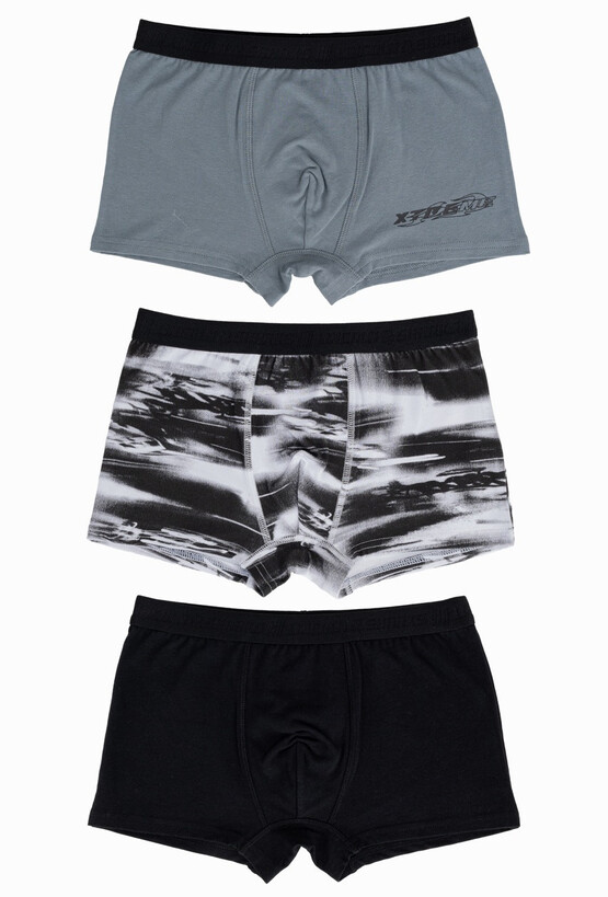 Zestaw 3 komfortowych bokserek chłopięcych w modnych kolorach: gładkie czarne, szare z nadrukiem i dynamicznym wzorem w odcieniach czerni i bieli. Wykonane z miękkiej i oddychającej bawełny z dodatkiem elastanu, zapewniają idealne dopasowanie do ciała i pełną swobodę ruchów przez cały dzień.