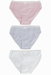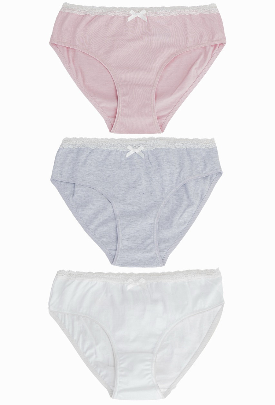 Zestaw majtek dziewczęcych 3-pak w stonowanych kolorach, wykonane z wysokiej jakości 100% bawełny. W komplecie: - 1 para różowa, - 1 para jasnoszara, - 1 para biała. Wszystkie modele posiadają delikatną koronkę, ozdobną kokardkę i elastyczny pas, który nie uciska i zapewnia wygodę noszenia przez cały dzień.
