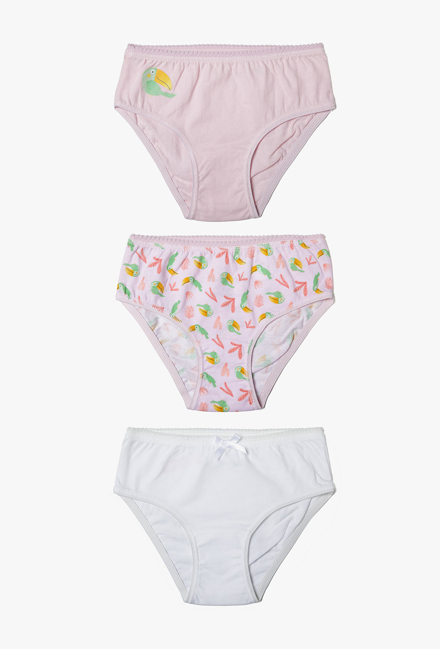 Zadbaj o codzienny komfort swojej córeczki, wybierając bieliznę wykonaną z najwyższej jakości materiałów. Ten 3-częściowy zestaw fig to połączenie uroczej, tropikalnej estetyki z funkcjonalnością, której potrzebuje każde dziecko podczas intensywnego dnia pełnego zabaw. Jasnoróżowe majtki ozdobione subtelną grafiką uśmiechniętego tukana na boku. Model w intensywniejszym odcieniu różu, pokryty gęstym nadrukiem małych tukanów i egzotycznych liści. Ponadczasowa biel ozdobiona małą, satynową kokardką na środku, co nadaje im wyjątkowo dziewczęcego charakteru.