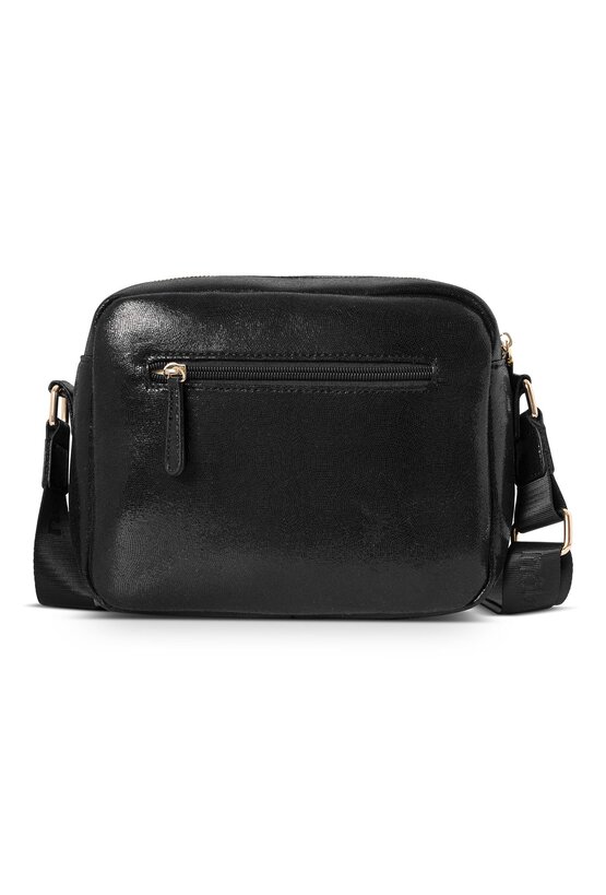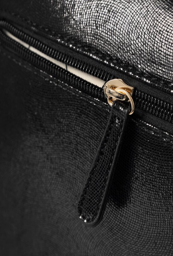 Średniej wielkości model mieści format A5, co sprawia, że doskonale sprawdzi się na co dzień – do pracy, na spotkania czy spacery. Wykonana z wysokiej jakości tworzywa z delikatnym, metalicznym połyskiem, przyciąga uwagę wzorem przypominającym błyszczącą mozaikę. Główna komora oraz praktyczna zewnętrzna kieszeń zapinane są na suwak, dzięki czemu wszystkie rzeczy pozostają bezpieczne. Wnętrze kryje dwie kieszonki, w tym jedną na zamek – idealną na drobiazgi. Regulowany, parciany pasek z logo pozwala dopasować sposób noszenia do swoich potrzeb – przez ramię lub na ramieniu. To ponadczasowy model, który nada blasku każdej stylizacji. Wymiary: 23 cm x 19 cm x 9 cm.