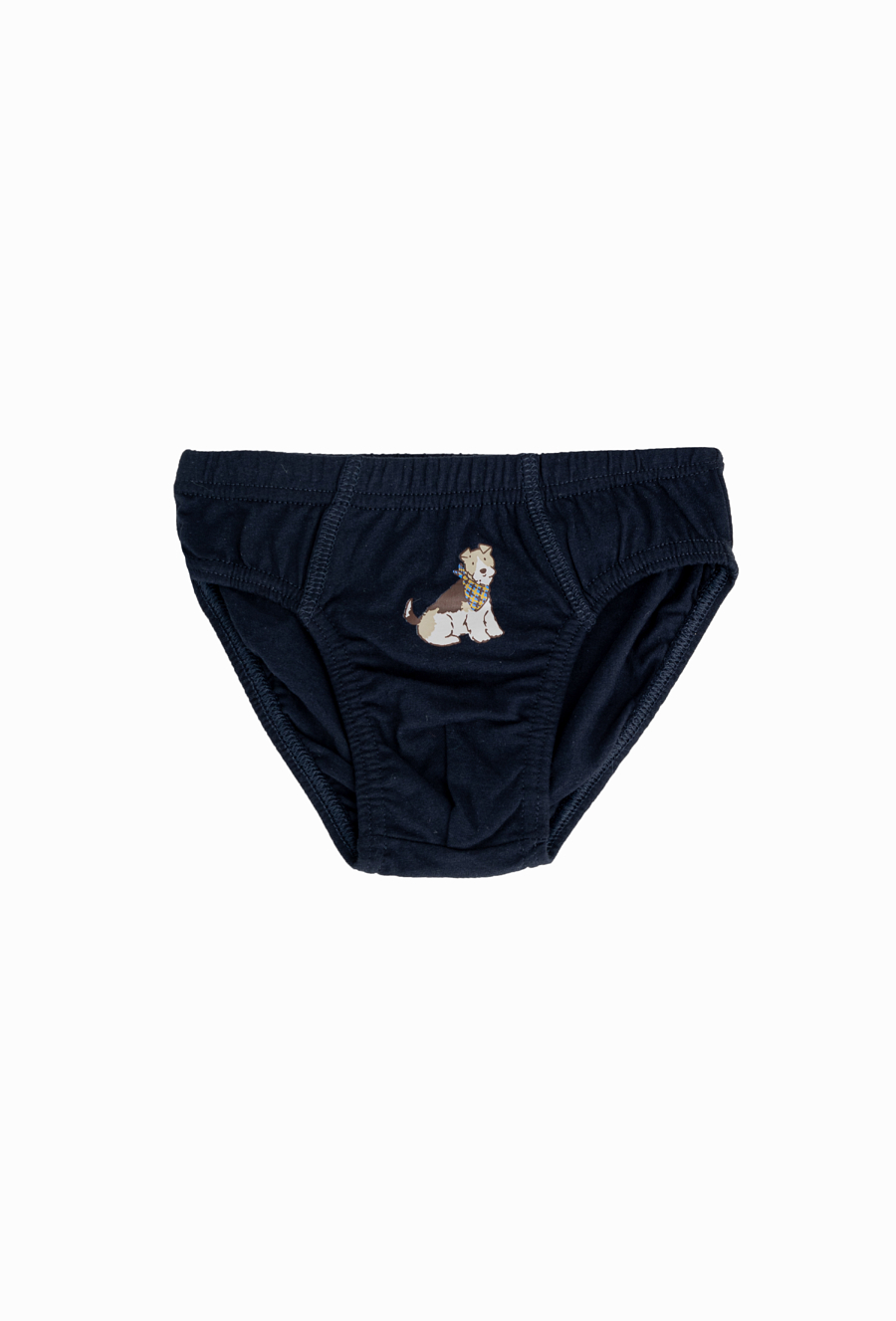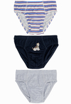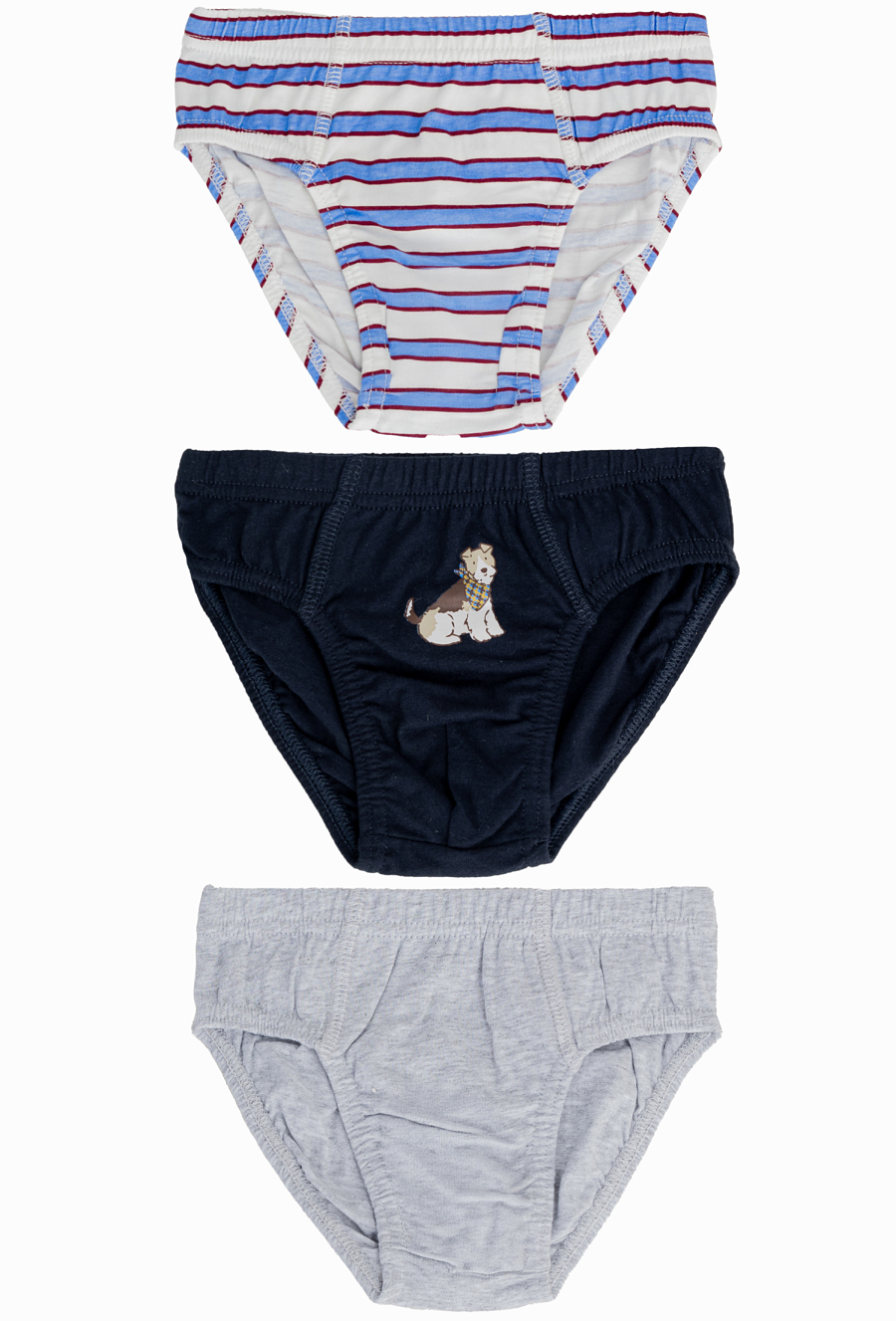 Komfortowe i praktyczne slipy chłopięce w 3-paku. Każda para wykonana została z 100% miękkiej bawełny, co zapewnia wygodę i przewiewność przez cały dzień. Zestaw zawiera trzy różne wzory: w paski (niebiesko-czerwone), granatowe z haftem psa i gładkie szare.