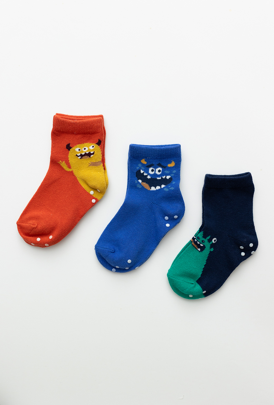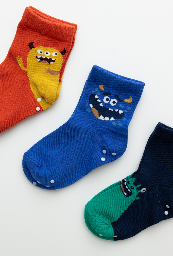 Zestaw 3 par skarpetek chłopięcych z miękkiej, elastycznej dzianiny. Wesołe wzory w potworki w intensywnych kolorach: czerwonym, niebieskim i granatowym. Antypoślizgowe kropki na spodzie zwiększają bezpieczeństwo podczas pierwszych kroków. Elastyczne ściągacze zapewniają wygodne dopasowanie i nie uciskają nóżki. Idealne na co dzień – do domu, żłobka czy na spacer.