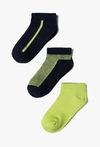 Postaw na wyrazisty, nowoczesny wygląd! Ten zestaw trzech par skarpet to idealna propozycja dla chłopców, którzy lubią sportowy styl z mocnym akcentem kolorystycznym. Klasyczna, głęboka czerń została tu przełamana energetyczną, neonową zielenią, co nadaje skarpetkom unikalnego, gamingowego charakteru. Elastyczne wykończenie góry skarpetki dba o to, by materiał nie uciskał nogi, zapewniając swobodny przepływ krwi przy jednoczesnym stabilnym trzymaniu się na kostce.