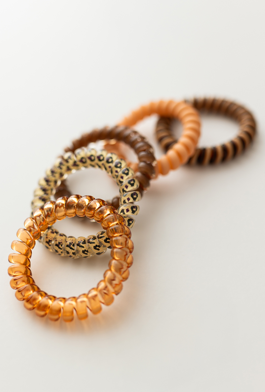 Praktyczne i modne! Zestaw 5 gumek do włosów typu sprężynka to idealny wybór dla każdej dziewczynki. Elastyczne i wygodne, nie ciągną włosów i świetnie sprawdzają się w codziennych fryzurach – zarówno w domu, jak i w szkole. Gumki są lekkie, trwałe i dostępne w pięknych odcieniach brązu, beżu i bursztynu. Dzięki różnorodności kolorów łatwo dopasować je do stroju lub innych akcesoriów. W zestawie znajduje się również gumka z modnym zwierzęcym wzorem.