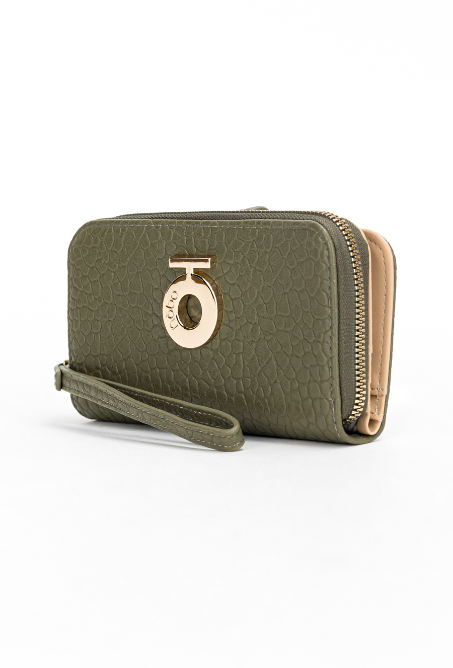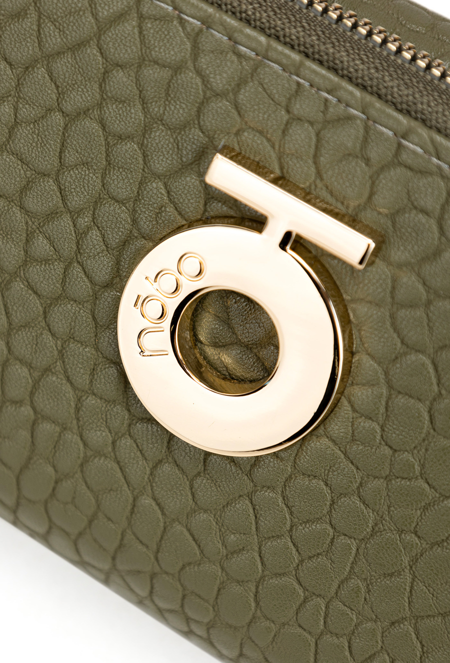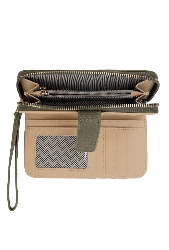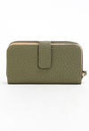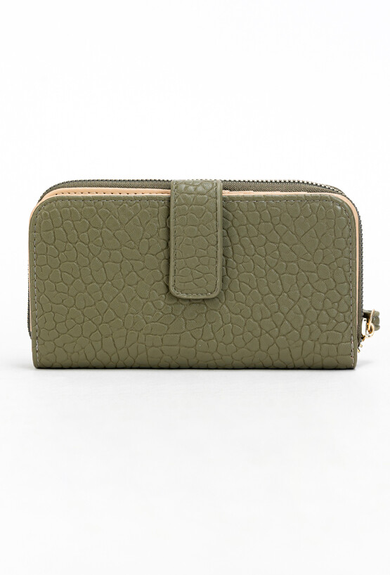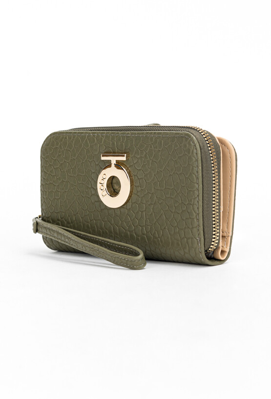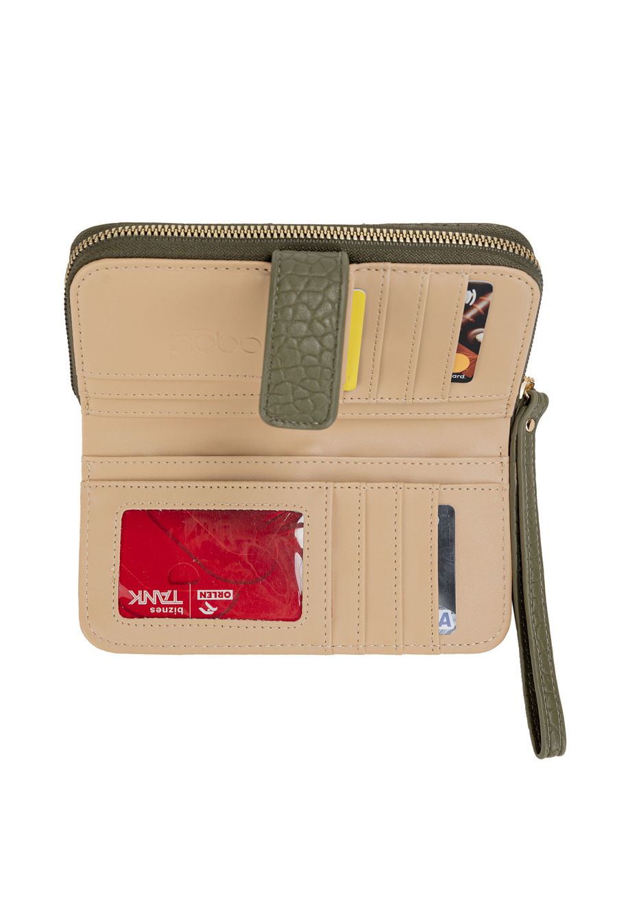 Portfel damski w oliwkowo-zielonym kolorze to połączenie funkcjonalności i elegancji. Wykonany z wysokiej jakości materiału o delikatnej fakturze, ozdobiony złotym logo na środku. Model w prostokątnym kształcie oferuje 13 kieszonek, które umożliwiają wygodne przechowywanie kart płatniczych, lojalnościowych, wizytówek oraz dokumentów. Dodatkową zaletą jest oddzielna część na bilon z zamykaną kieszonką na monety, co pozwala utrzymać idealny porządek. Zapięcie na suwak w zamykanej części portfela gwarantuje bezpieczeństwo przechowywanych rzeczy. To praktyczny dodatek, który sprawdzi się zarówno na co dzień, jak i jako elegancki prezent. Wymiary: 20 cm x 14 cm x 2 cm.