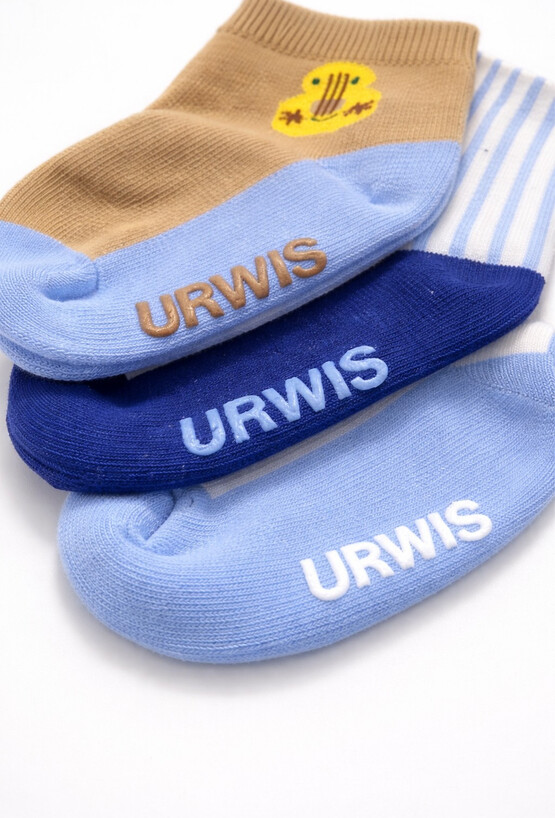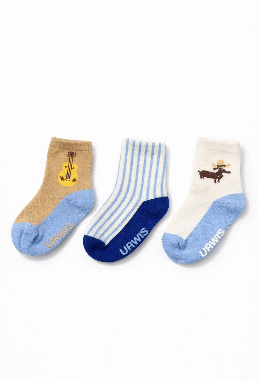 Zestaw 3 par skarpetek dla chłopca w miksie wzorów: gitara, piesek i paski. Każda para ma na spodzie antypoślizgowy napis „URWIS”, który pomaga utrzymać lepszą przyczepność podczas zabawy w domu.