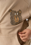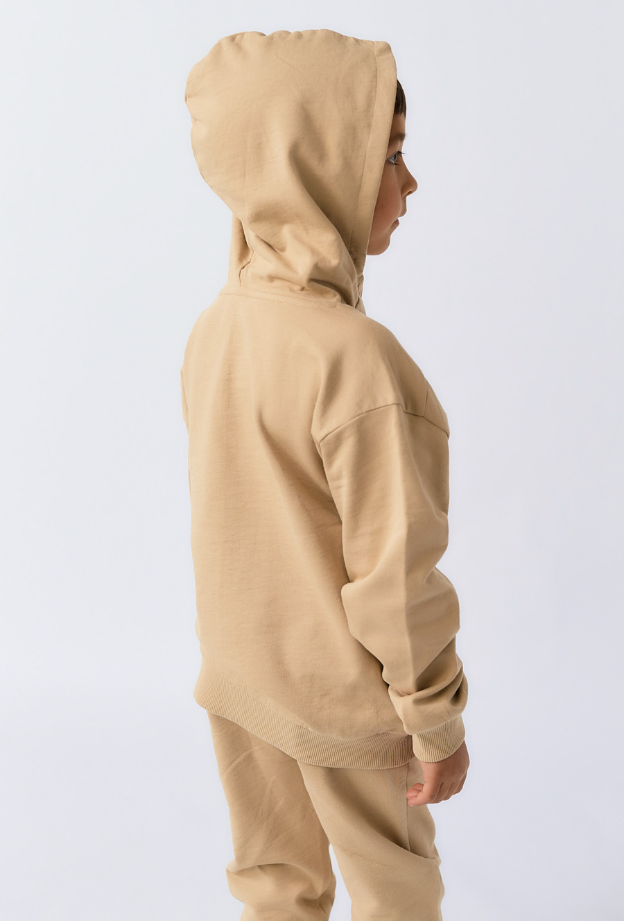 Postaw na wygodę i styl! Ta beżowa bluza chłopięca z kapturem to idealna propozycja na chłodniejsze dni – do szkoły, przedszkola lub na weekendowe wypady. Uszyta z wysokiej jakości, 100% bawełny, zapewnia komfort noszenia i doskonałą oddychalność. Modny krój bez zapięcia, z dużą kieszenią typu kangurka oraz naszywką z literą „B” z cekinów dodaje bluzie nowoczesnego charakteru. Świetnie komponuje się zarówno z jeansami, jak i dresami.