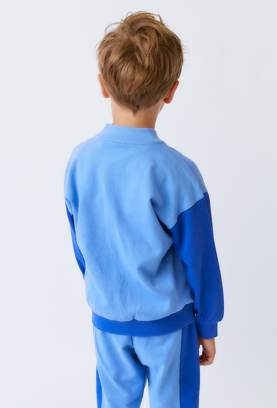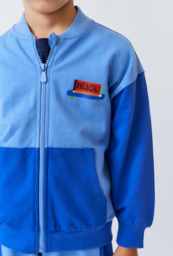 Stylowa, dwukolorowa bluza dziecięca w odcieniach niebieskiego, wykonana w 100% z miękkiej i przewiewnej bawełny. Model rozpinany na całej długości, ze stójką chroniącą przed chłodem. Z przodu praktyczne kieszenie oraz niewielki nadruk „HELLO!”, nadający całości energicznego, młodzieżowego charakteru. Idealna do szkoły, na spacer czy aktywności na świeżym powietrzu – zapewnia komfort noszenia i swobodę ruchów.
