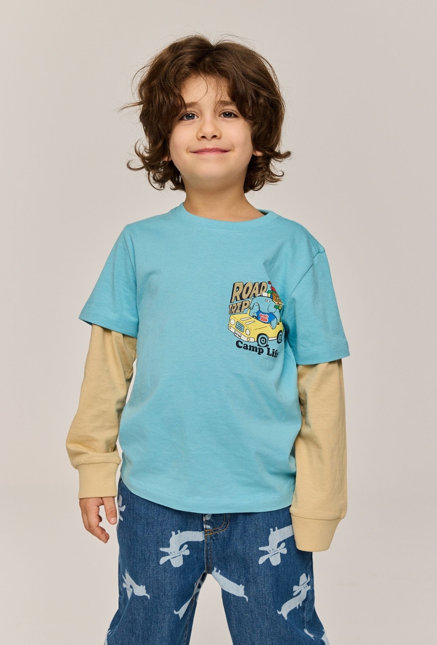 Ta niebieska bluzka z długim rękawem 2w1 to wygodny klasyk w dziecięcej szafie — wygląda jak zestaw T-shirt + longsleeve, a zakłada się jak jedna rzecz. Wykonana z 100% bawełny, jest miękka i przyjemna w noszeniu przez cały dzień. Podwójny rękaw nadaje stylowego, warstwowego efektu, a uroczy nadruk z autkiem dodaje całości charakteru i spodoba się małym fanom motoryzacji.