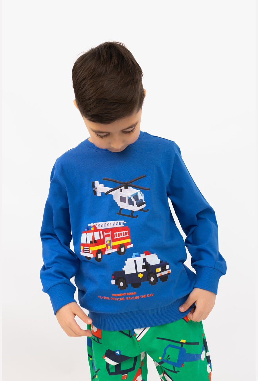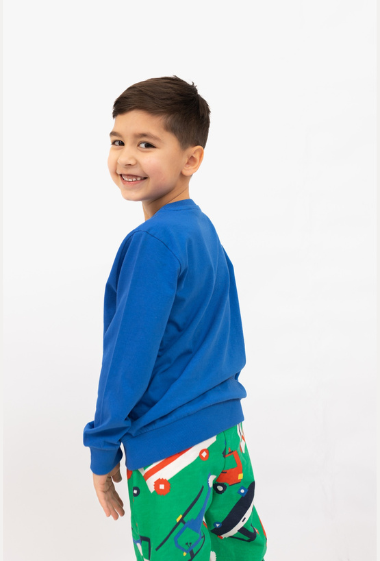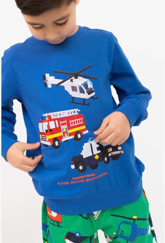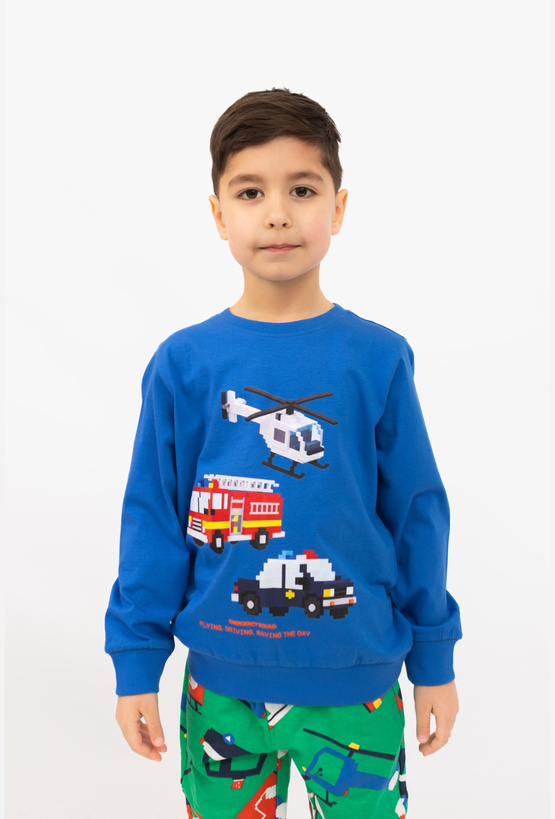 Niebieska bluzka chłopięca z długim rękawem to idealna opcja na chłodniejsze dni – miękka, wygodna i gotowa na codzienne przygody. Z przodu znajduje się efektowny nadruk pojazdów zbudowanych z klocków: helikopter, wóz strażacki i radiowóz, które od razu wpadają w oko małym fanom motoryzacji i maszyn. Model ma ściągacze przy rękawach i na dole, dzięki czemu dobrze leży i nie podwija się podczas zabawy.