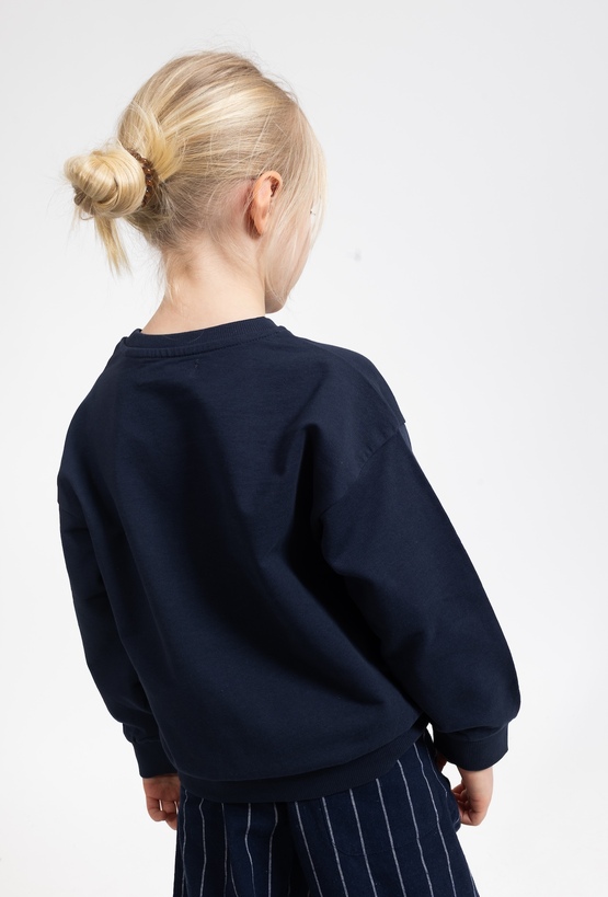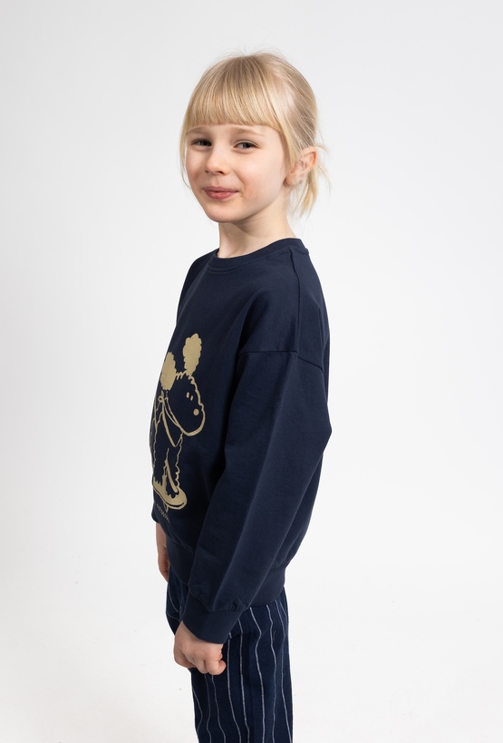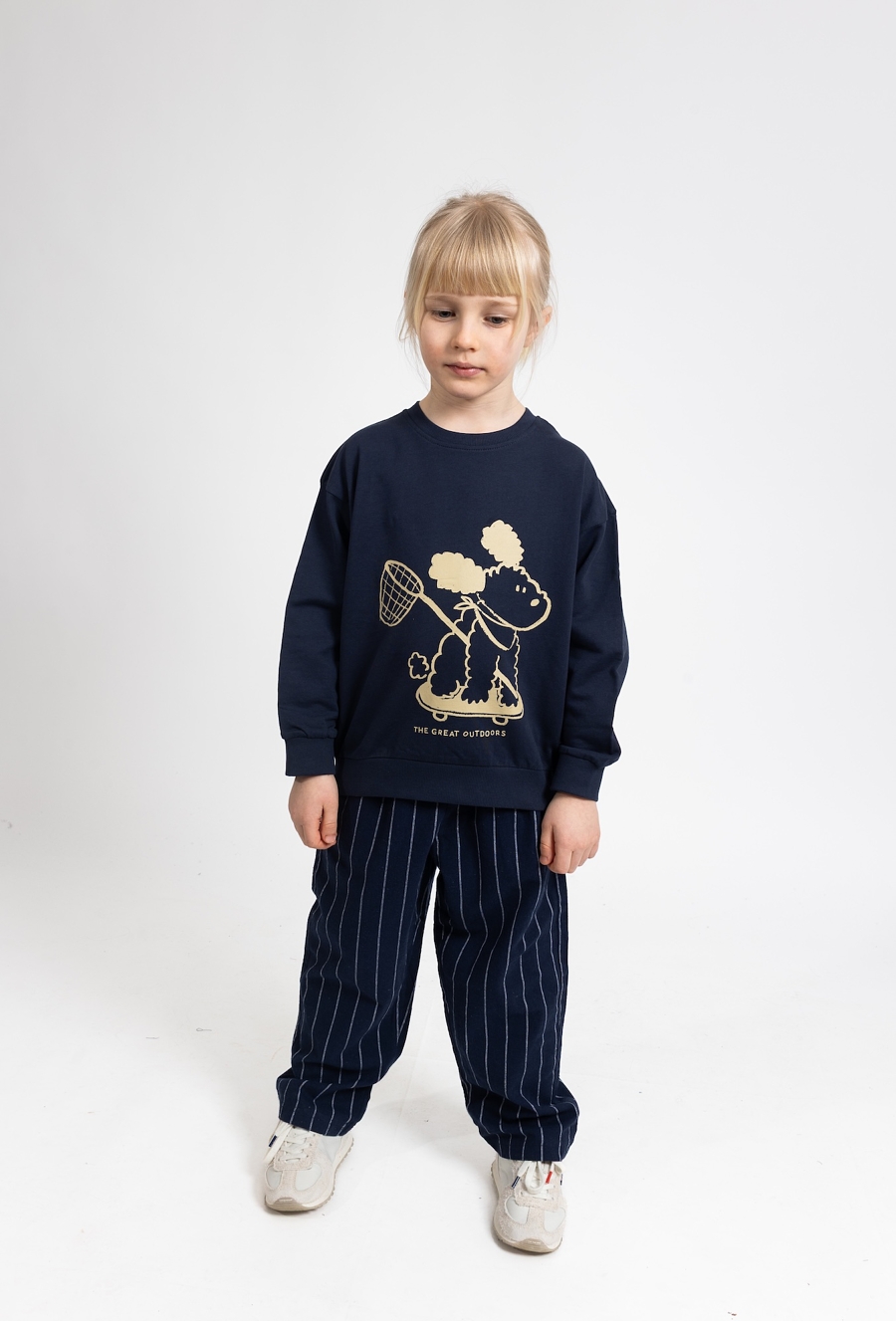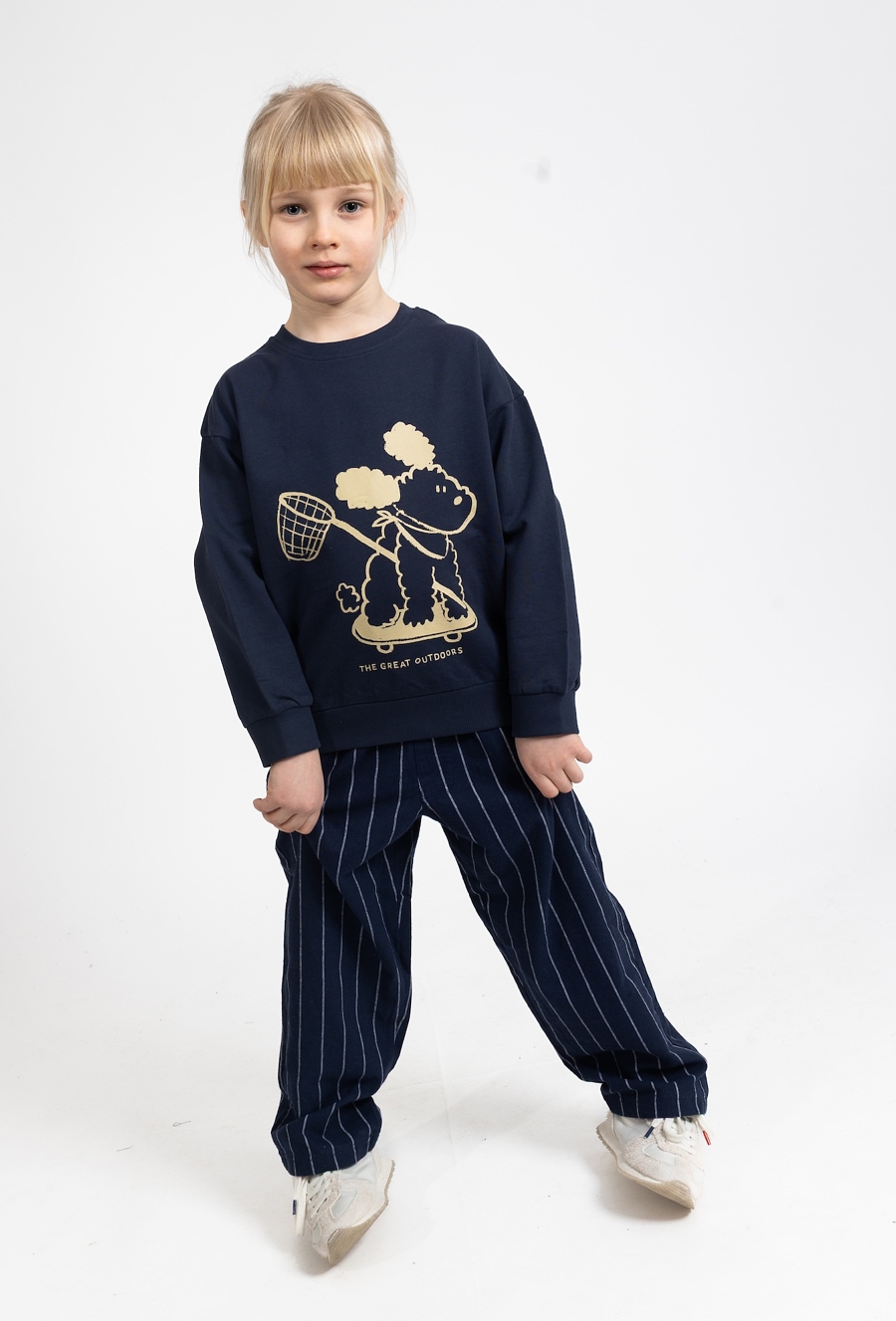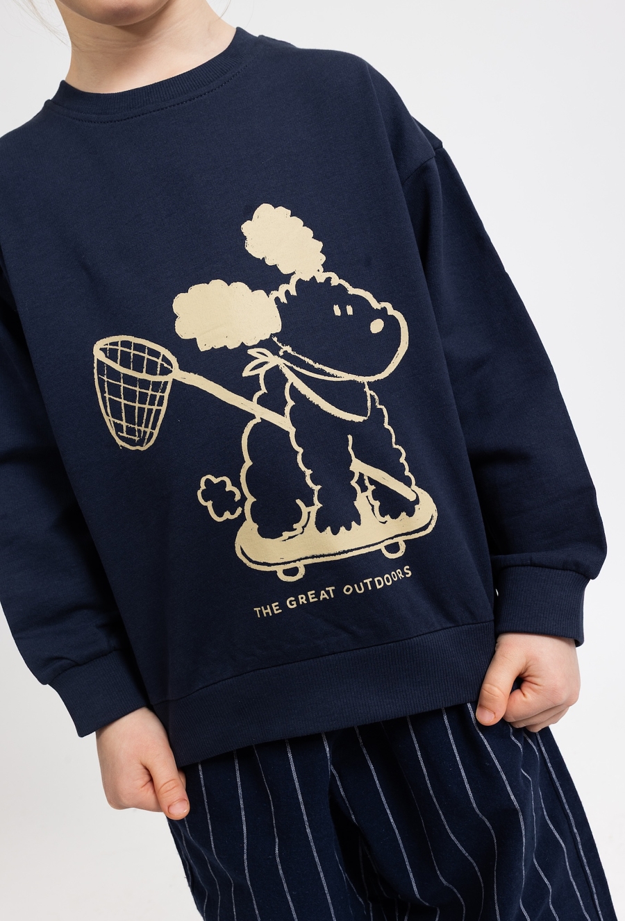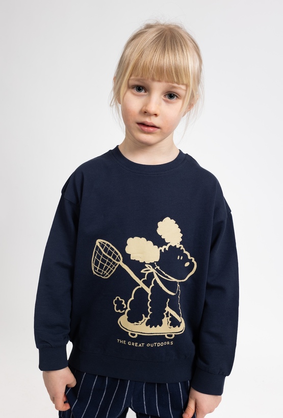 Granatowa bluza w kroju standard została uszyta z 100% bawełny, dzięki czemu jest przyjemna w dotyku i świetnie sprawdzi się w przedszkolu, szkole czy na spacerze. Z przodu znajduje się wyrazisty nadruk z pieskiem na deskorolce oraz napis „The Great Outdoors”, który dodaje całości fajnego, „outdoorowego” charakteru.