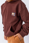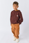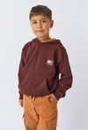 Bordowa bluza z kapturem dla chłopca to świetny wybór na chłodniejsze dni. Uszyta w 100% z naturalnej bawełny, zapewnia komfort i oddychalność przez cały dzień. Z przodu znajduje się niewielka naszywka z górskim motywem, która dodaje całości przygodowego charakteru. Bluza posiada praktyczną kieszeń kangurkę, idealną na drobiazgi lub schowanie rąk w chłodne dni. Luźny fason nie krępuje ruchów, sprawdzi się zarówno do szkoły, jak i na weekendowe wypady.