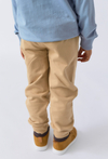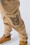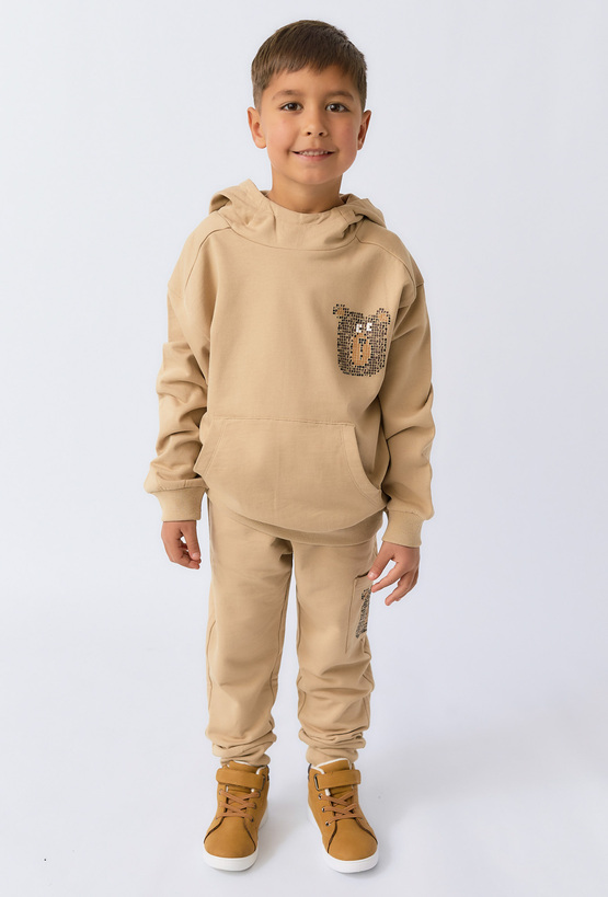 Wygoda, styl i swoboda ruchów – to właśnie oferują te chłopięce spodnie dresowe w kolorze beżowym. Uszyte z miękkiej 100% bawełny, idealnie sprawdzą się zarówno na co dzień, jak i podczas aktywności w przedszkolu czy na spacerze. Spodnie posiadają elastyczny pas i ściągacze przy nogawkach, dzięki czemu świetnie dopasowują się do sylwetki dziecka. Dodatkowo ozdobna naszywka na jednej z nogawek nadaje im sportowego charakteru. Doskonale komponują się z bluzą z tej samej kolekcji.