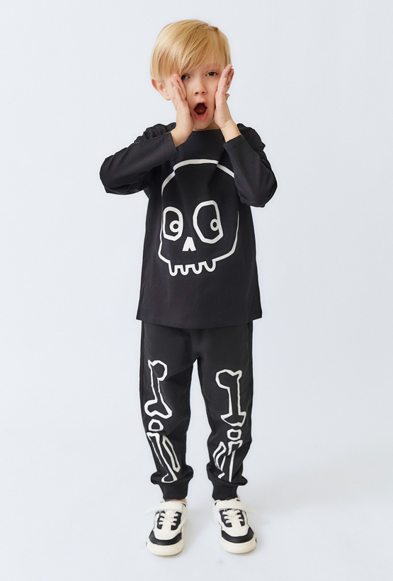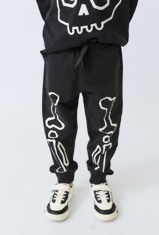Czarne spodnie dresowe dziecięce z nadrukiem kości – Halloween.