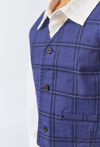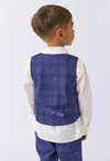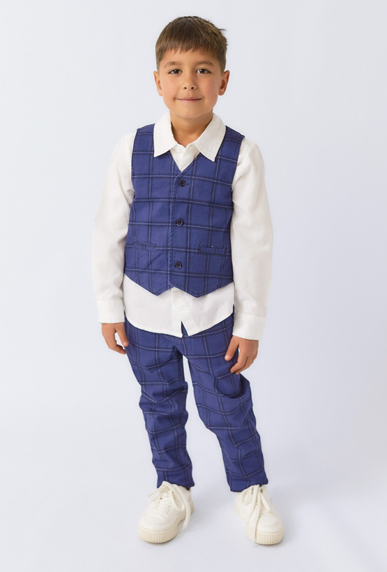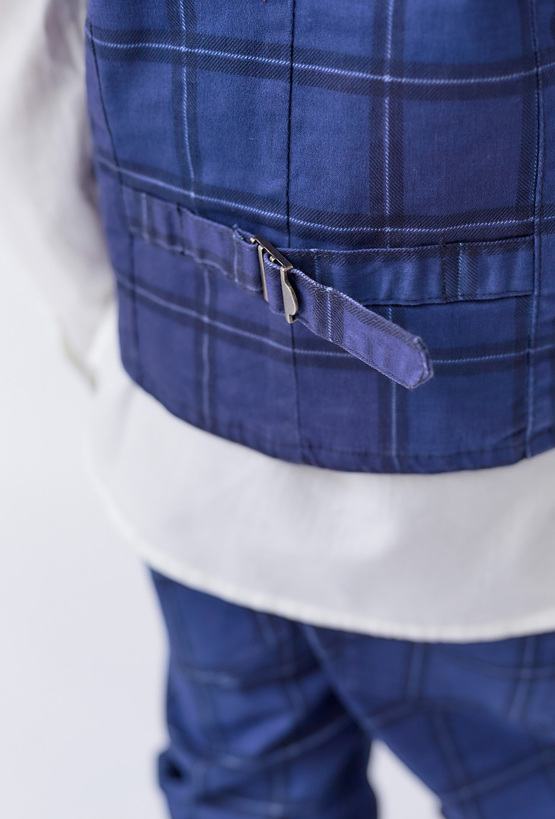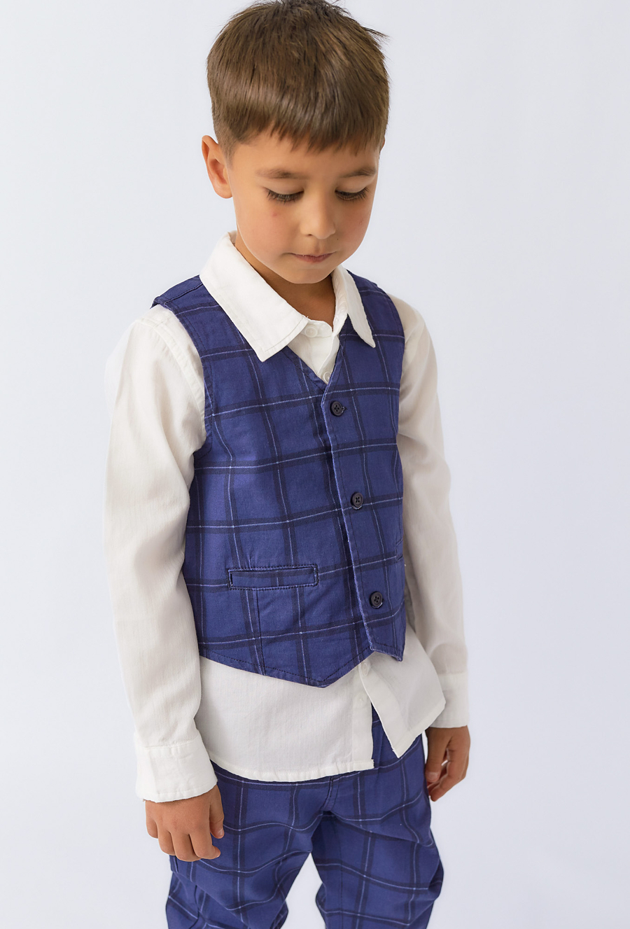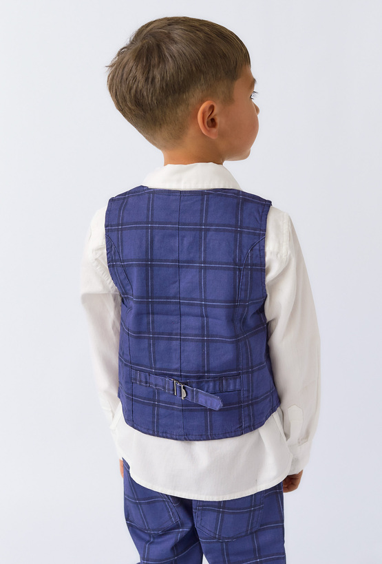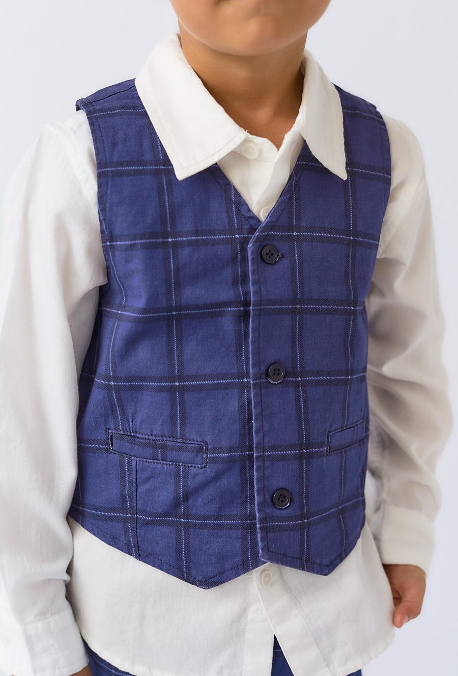Dodaj stylu każdej wyjątkowej okazji dzięki tej chłopięcej kamizelce garniturowej w elegancką granatową kratę. Wykonana z wysokiej jakości tkaniny z dodatkiem elastanu- zapewnia wygodę i swobodę ruchów przez cały dzień. Bezrękawnik ma klasyczny krój z zapięciem na trzy guziki, stójką i imitacją kieszonek. Idealnie komponuje się z koszulą i spodniami z tym samym wzorem, tworząc spójną, elegancką stylizację dla małego dżentelmena.