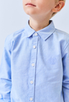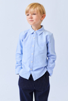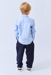 Stylowa koszula chłopięca w odcieniu błękitu, uszyta z wysokiej jakości bawełnianej tkaniny. Posiada klasyczny kołnierzyk, długie rękawy oraz zapięcie na guziki. Dzięki prostemu fasonowi i oddychającemu materiałowi zapewnia komfort noszenia przez cały dzień. Doskonały wybór na święta, uroczystości, rodzinne spotkania oraz szkolne wystąpienia.
