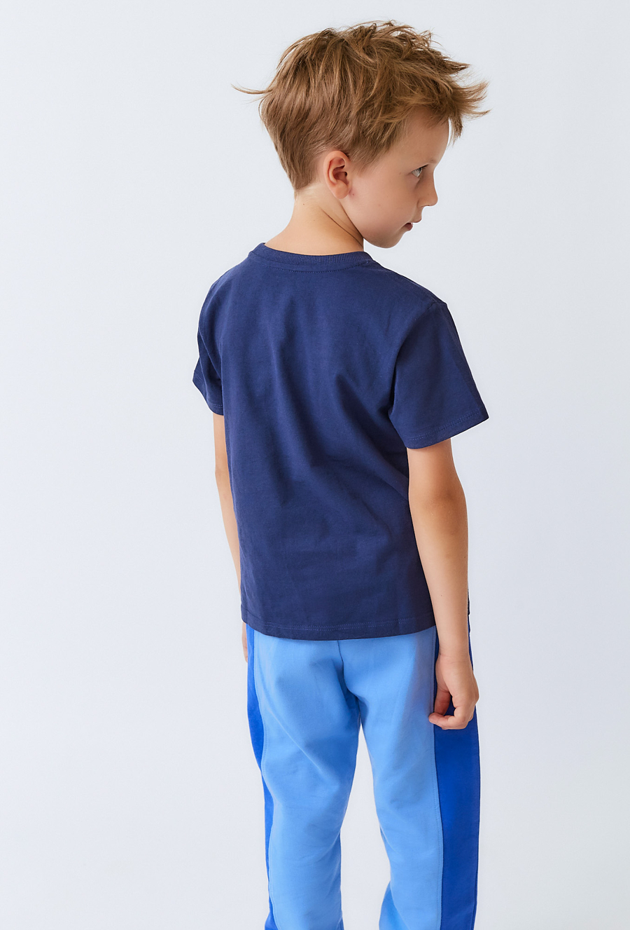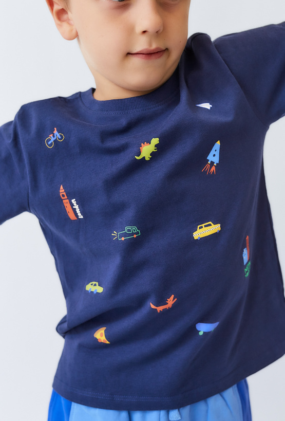 Granatowa koszulka chłopięca z kolorowymi nadrukami.