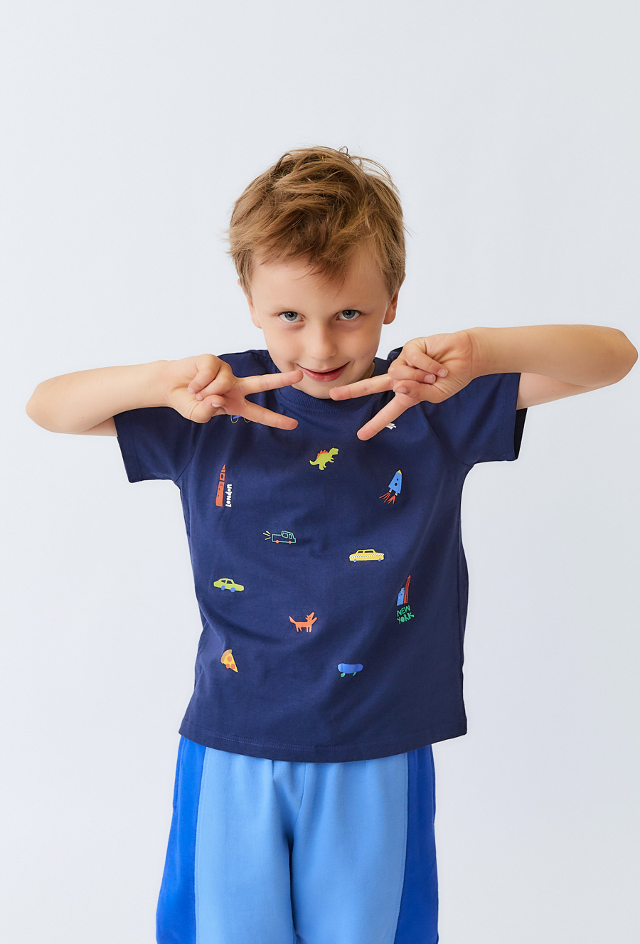 Granatowa koszulka chłopięca z krótkim rękawem ozdobiona została wieloma kolorowymi nadrukami – od rakiety, przez psa, po wieżę Big Ben i wieżowce Nowego Jorku. To energetyczny i wesoły element garderoby, który przypadnie do gustu każdemu małemu odkrywcy. Wykonana w 100% z miękkiej, przewiewnej bawełny, zapewnia komfort noszenia przez cały dzień. Idealna na podwórkowe zabawy, szkolne przygody czy rodzinne wyjścia.