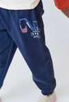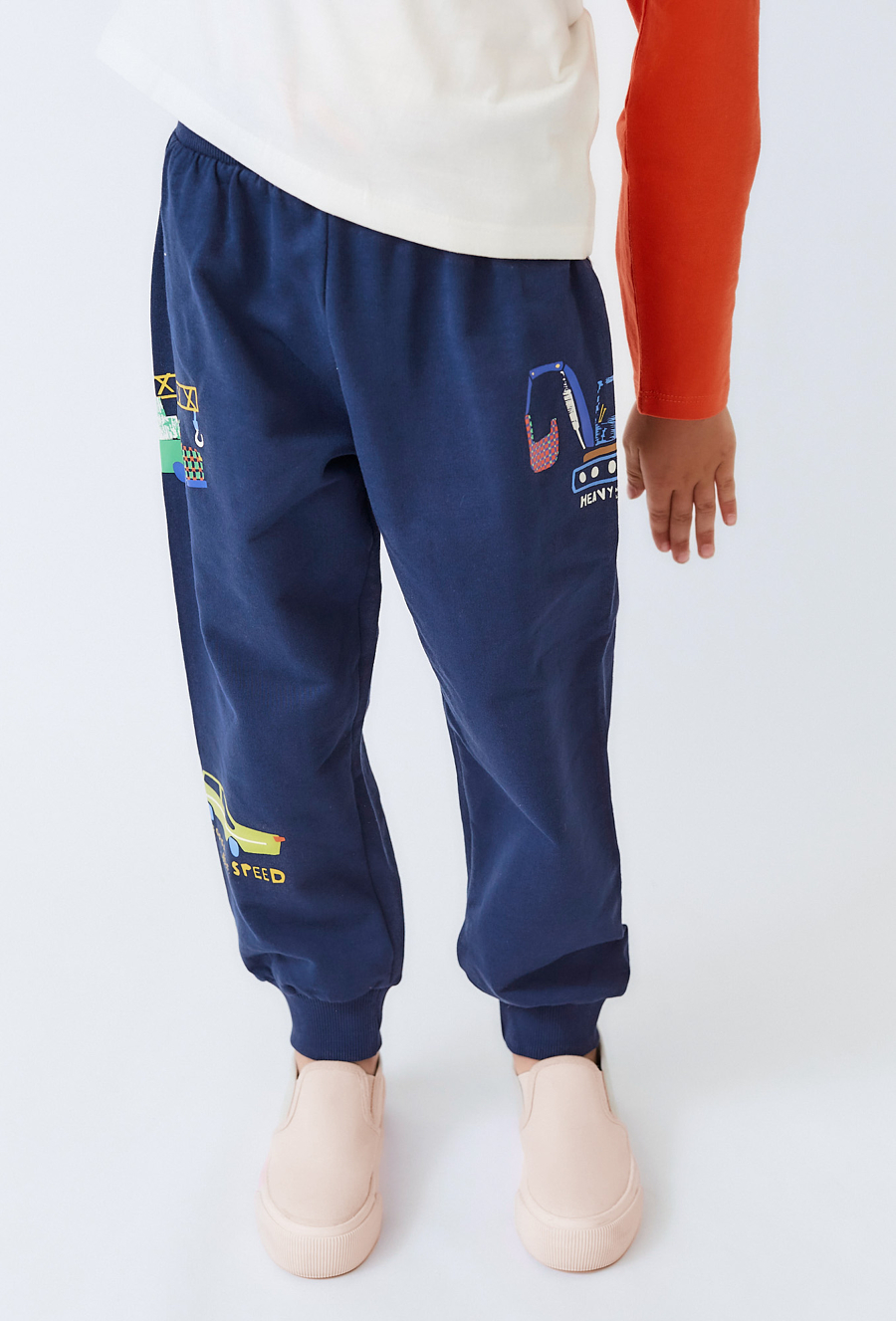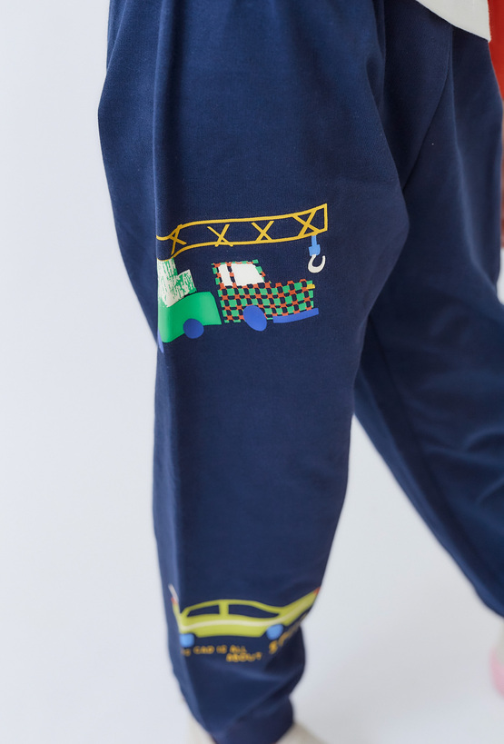 Granatowe spodnie dresowe dziecięce z nadrukiem aut.