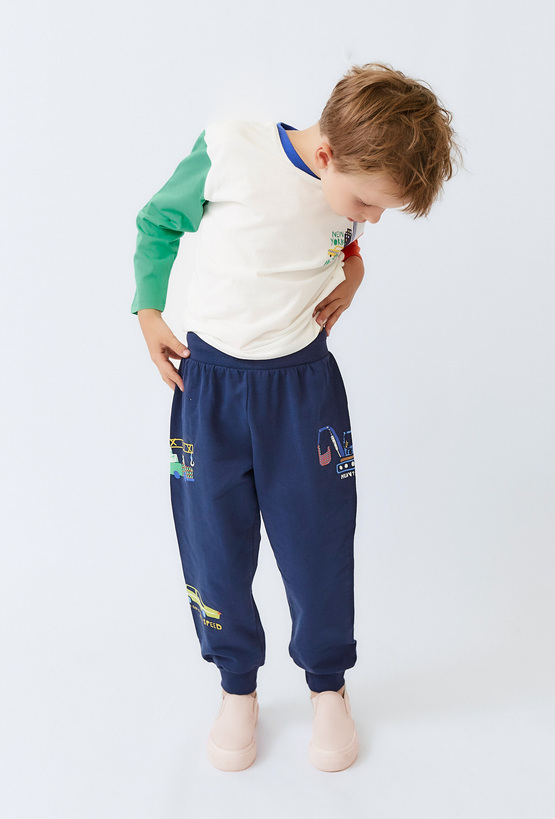 Granatowe spodnie dresowe dziecięce to wygoda i styl w jednym. Wykonane w 100% z wysokiej jakości bawełny, gwarantują komfort noszenia przez cały dzień. Na obu nogawkach umieszczono efektowne nadruki aut, które spodobają się każdemu małemu fanowi motoryzacji. Elastyczny pas z kontrastowym, pomarańczowym troczkiem oraz ściągacze przy nogawkach zapewniają doskonałe dopasowanie. Świetne na co dzień, do przedszkola czy na plac zabaw.