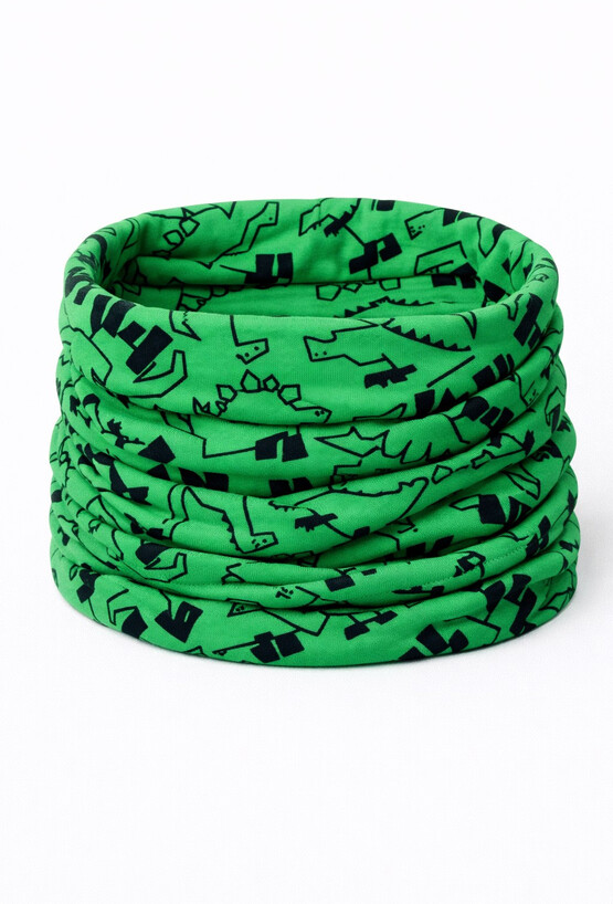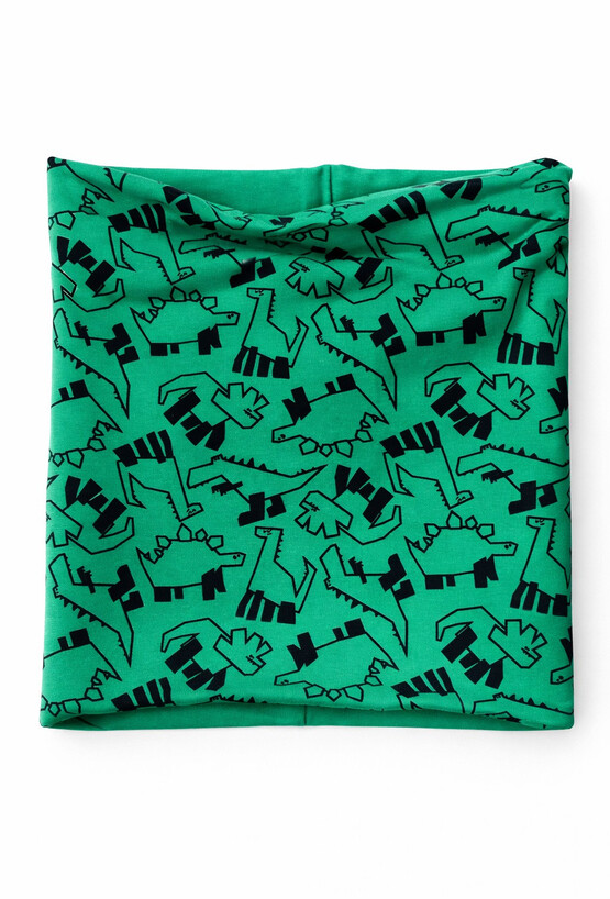 Cienki komin dla chłopca to praktyczny i stylowy dodatek na przejściowe pory roku. Wykonany z miękkiej, elastycznej dzianiny, zapewnia komfort noszenia i skuteczną ochronę szyi przed chłodem oraz wiatrem. Całą powierzchnię komina zdobi wyrazisty print z motywem dinozaurów, który przypadnie do gustu małym miłośnikom prehistorii. Elastyczny materiał sprawia, że komin łatwo się zakłada, dobrze dopasowuje do szyi i nie krępuje ruchów. Idealny do codziennych stylizacji – do kurtki, bluzy lub przejściowego płaszczyka.
