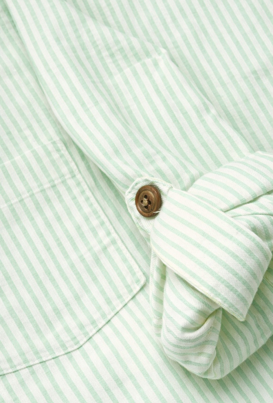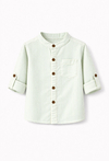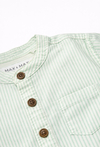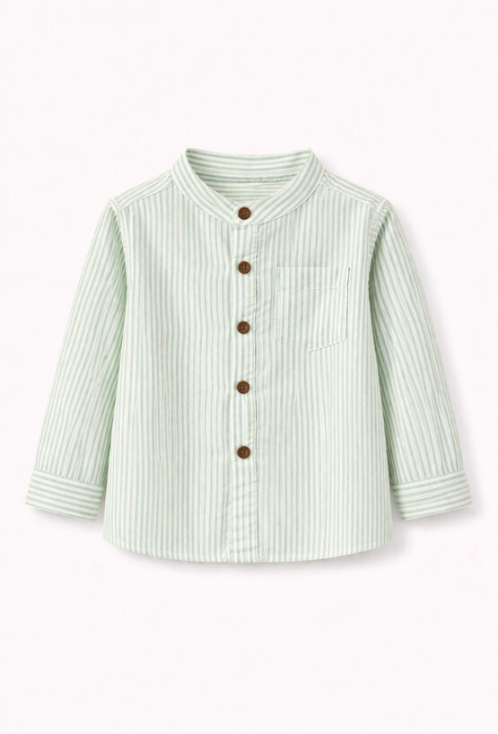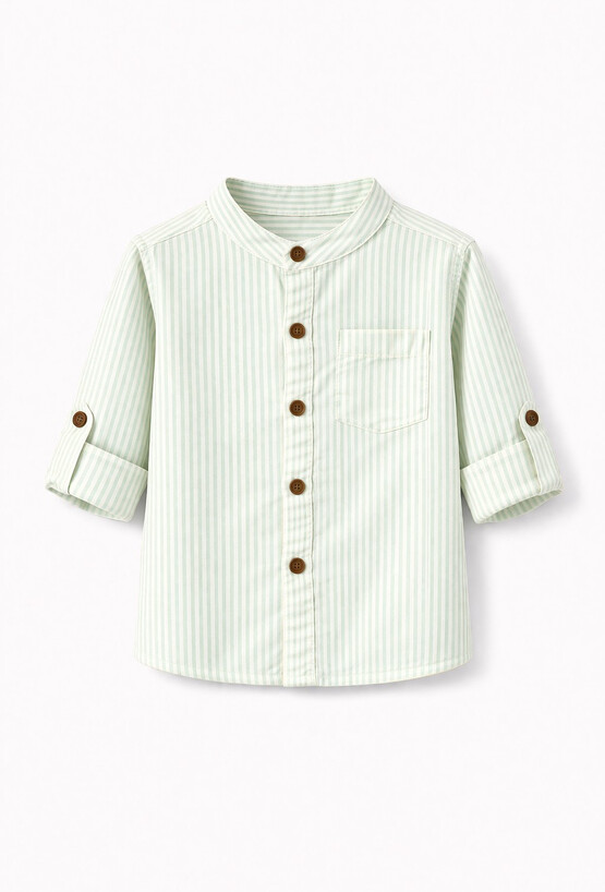 Lekka koszula dla chłopca uszyta w 100% z bawełny – idealna na cieplejsze dni, rodzinne wyjścia i szkolne uroczystości. Delikatny wzór w zielone paski dodaje jej elegancji, a stójka i kieszonka na przodzie podkreślają klasyczny styl.