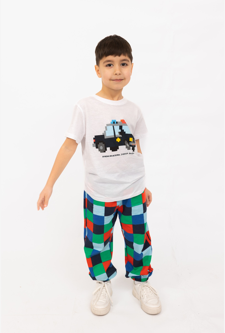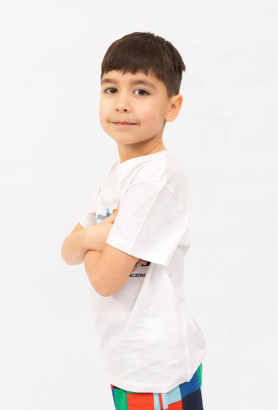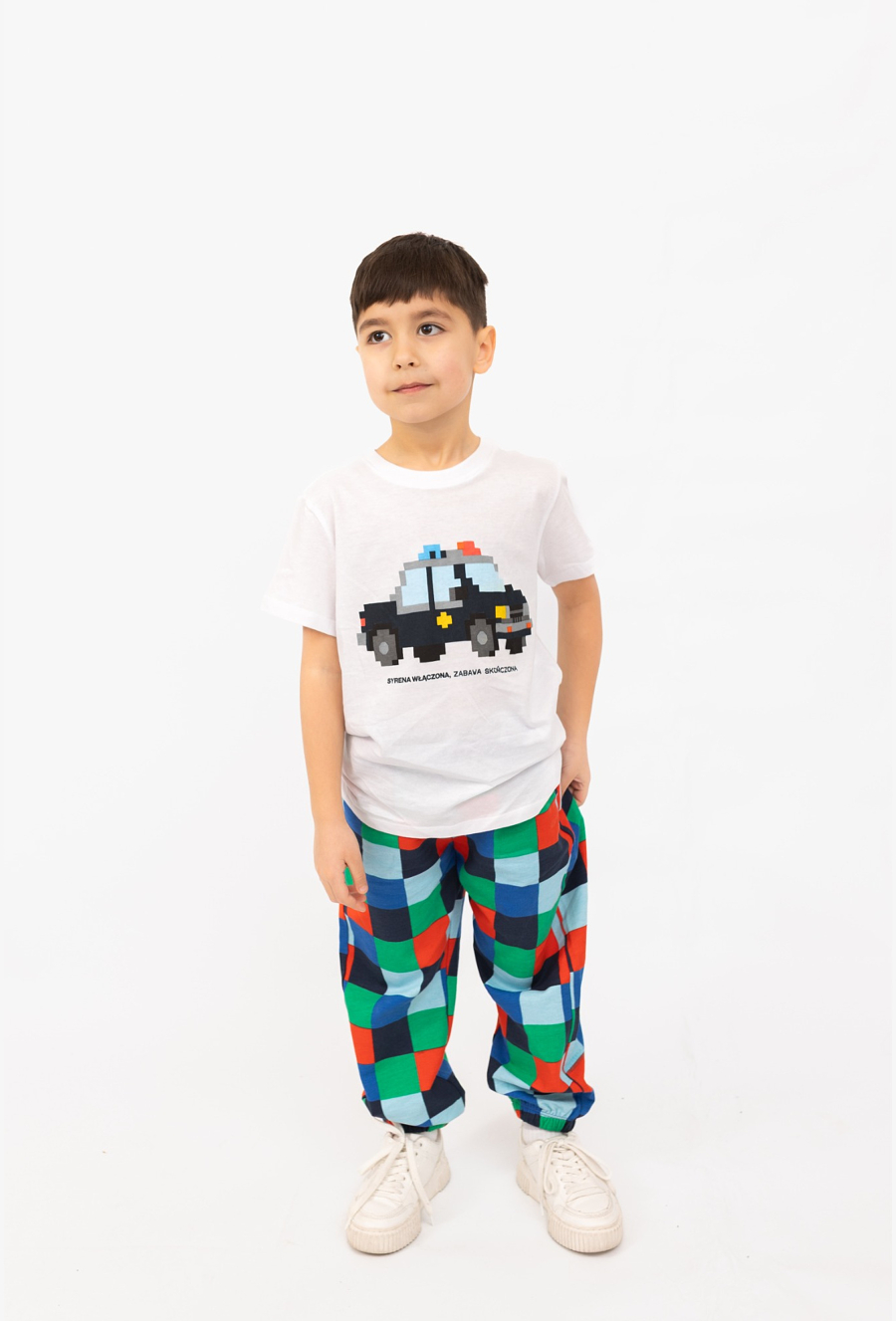 Biała koszulka chłopięca z nadrukiem wozu policyjnego zbudowanego z klocków to idealny wybór dla małych fanów motoryzacji i „pixelowych” klimatów. Na froncie znajduje się efektowny print oraz hasło: „Syrena włączona, zabawa skończona” – świetny akcent, który od razu przyciąga wzrok.