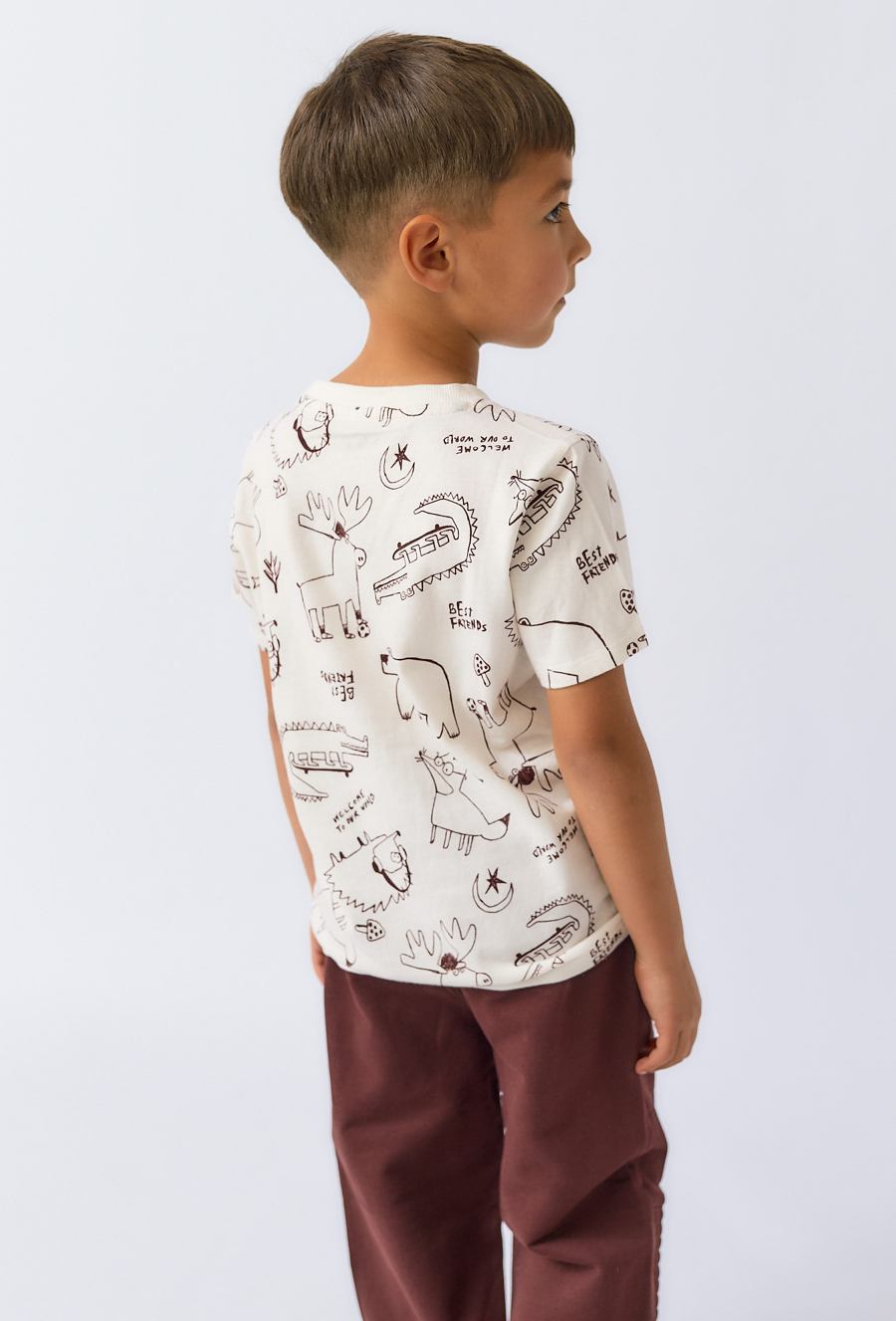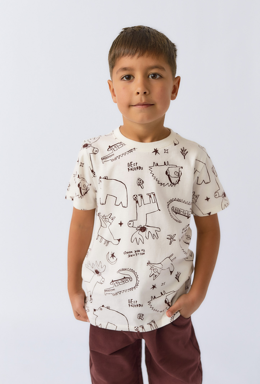 Urocza koszulka chłopięca z nadrukiem ręcznie rysowanych zwierząt i napisami „Best Friends” to świetny wybór dla małego odkrywcy. Wykonana z miękkiej bawełny, gwarantuje komfort noszenia przez cały dzień. Idealna na zabawę, do przedszkola czy na spacer.