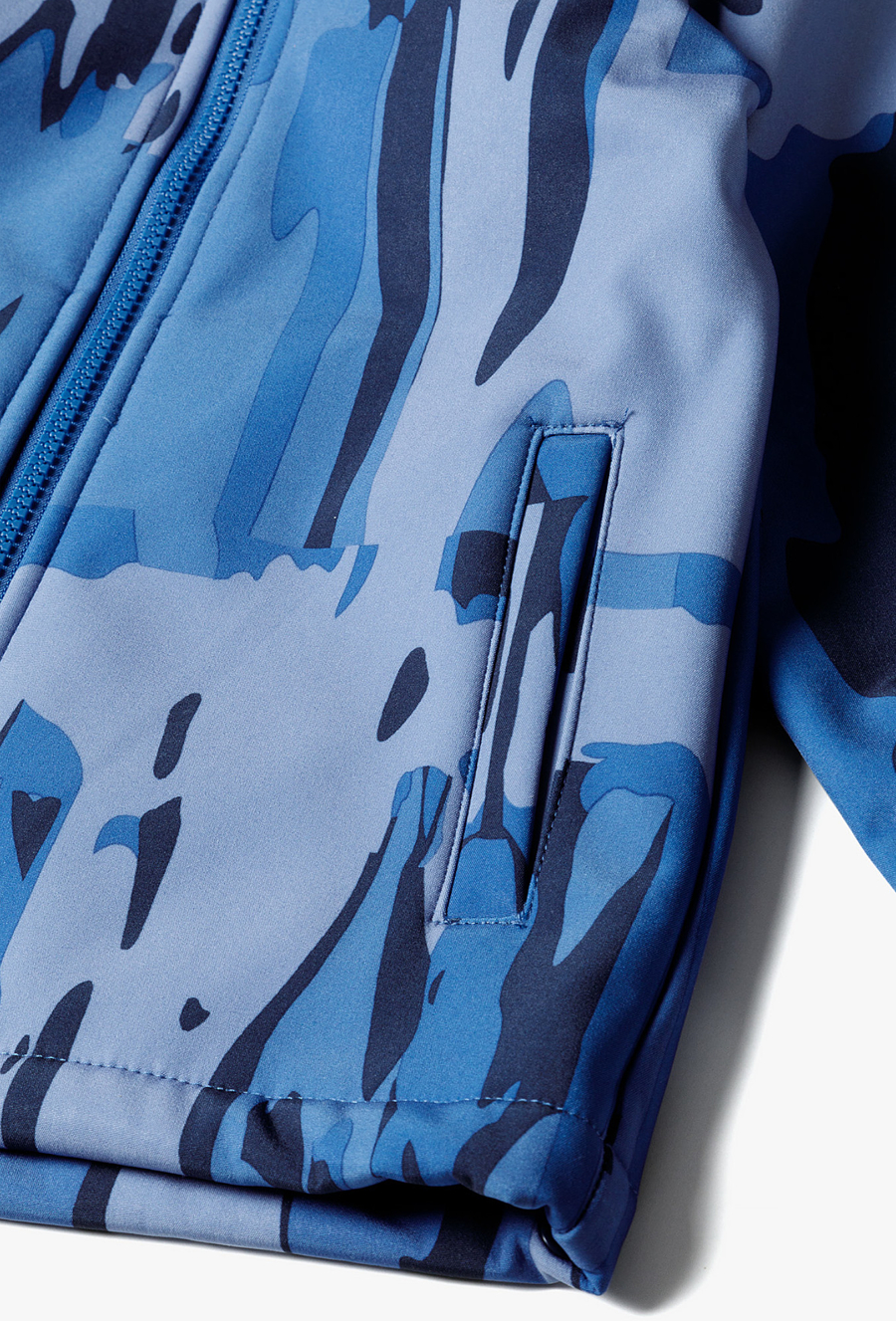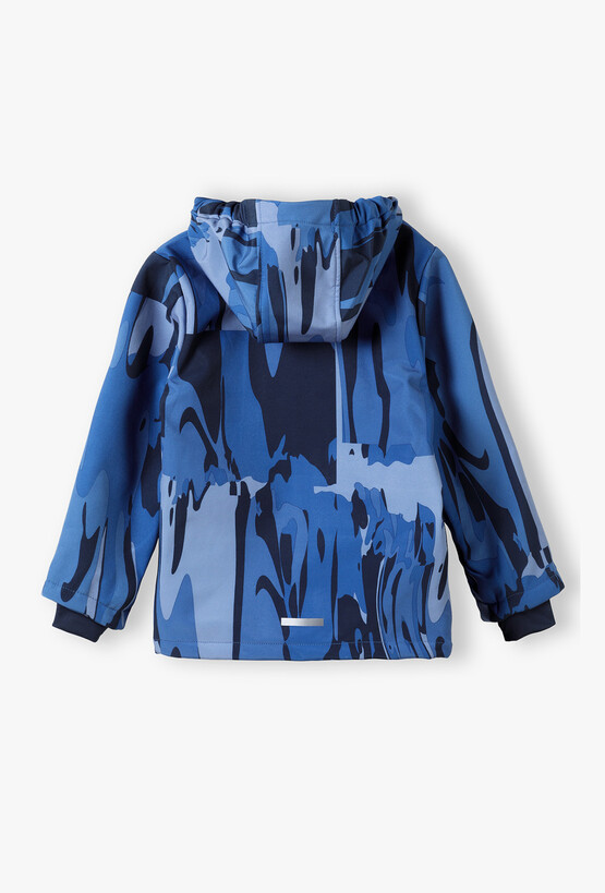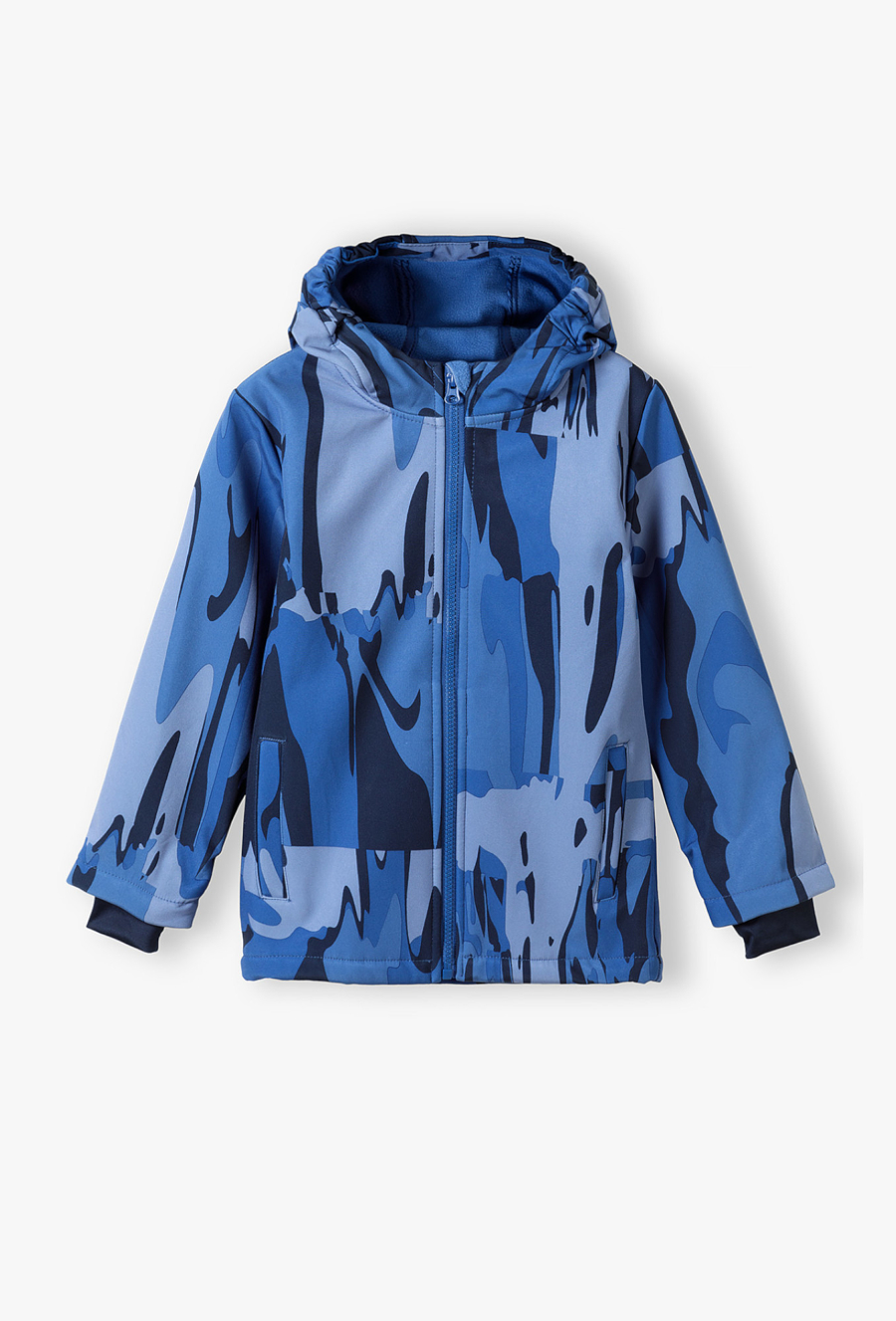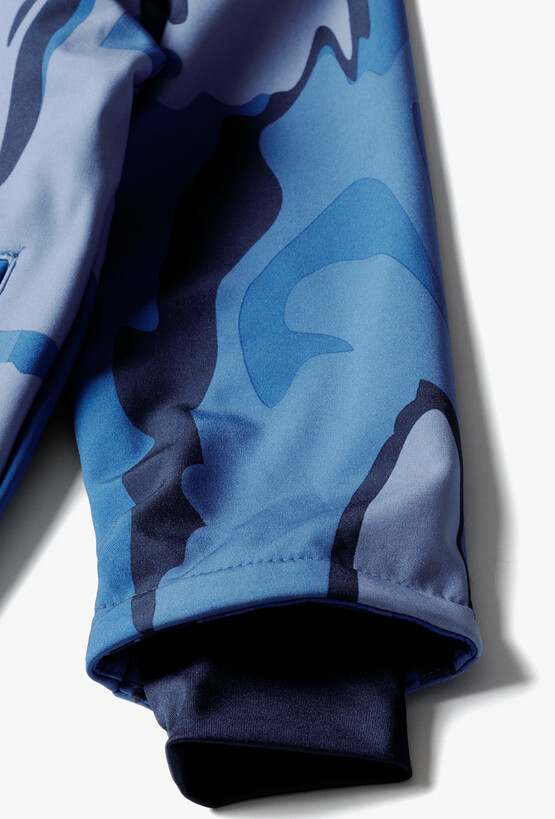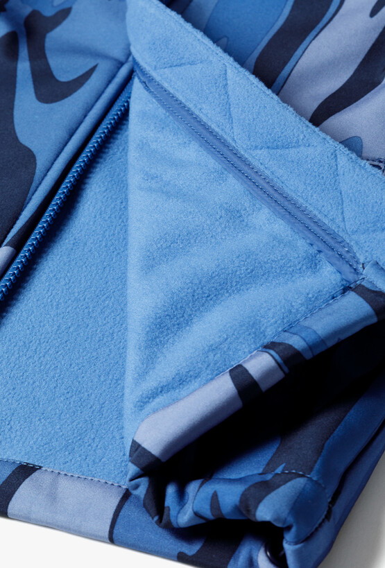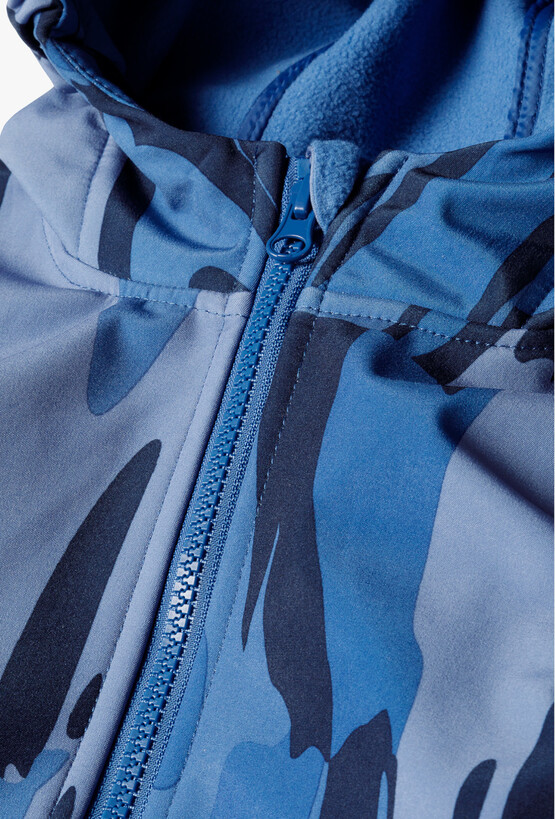 Przygotuj swojego małego odkrywcę na każdą pogodę! Ta niebieska kurtka typu softshell to idealny wybór na okres przejściowy, łączący nowoczesny design z zaawansowaną funkcjonalnością. Dzięki unikalnemu, abstrakcyjnemu wzorowi w odcieniach błękitu i granatu, kurtka prezentuje się dynamicznie i stylowo, zapewniając dziecku pełen komfort podczas zabaw na świeżym powietrzu. Cała kurtka, włącznie z kapturem, została podszyta miękkim, błękitnym polarem, który gwarantuje przyjemne ciepło nawet w chłodniejsze wiosenne dni. Wbudowany ściągacz na dole kurtki pozwala na jej dopasowanie do sylwetki, co dodatkowo izoluje przed zimnem.