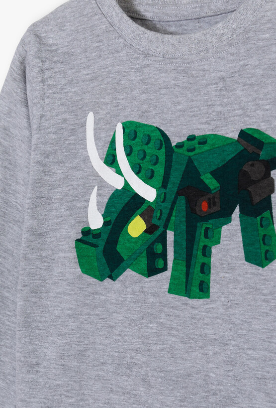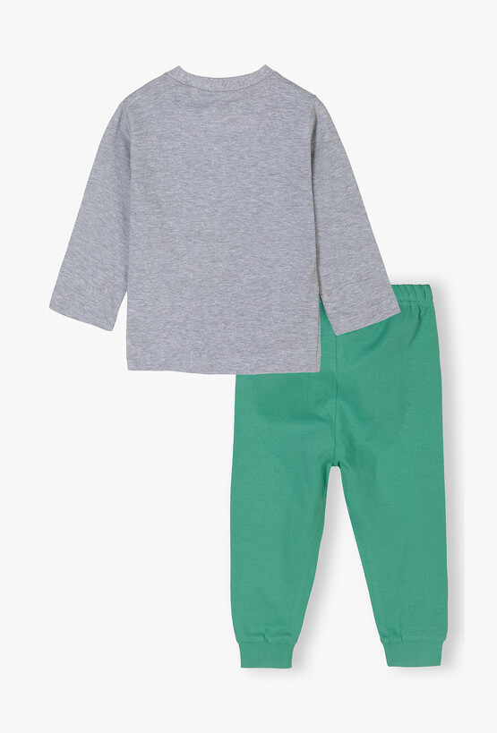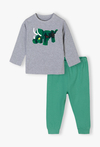 Zapewnij swojemu małemu odkrywcy najwyższy komfort podczas nocnego odpoczynku! Ta dwuczęściowa piżama to idealne połączenie wysokiej jakości materiałów z motywem, który rozpala dziecięcą wyobraźnię. Dzięki przemyślanemu krojowi i radosnej kolorystyce, wieczorne przygotowania do snu staną się czystą przyjemnością. Przód jasnoszarej bluzki zdobi duża grafika zielonego triceratopsa, który wygląda jak zbudowany z klocków konstrukcyjnych. To unikalne połączenie dwóch ulubionych pasji małych chłopców. Klasyczny longsleeve z okrągłym dekoltem, który nie uciska i ułatwia zakładanie piżamy. Kontrastowe, zielone spodnie o prostym kroju, które nie krępują ruchów podczas spania. Nogawki spodni zakończone są elastycznymi ściągaczami. Dzięki temu spodnie nie podwijają się w nocy, a stopy dziecka pozostają osłonięte, co gwarantuje niezakłócony chłód sen.