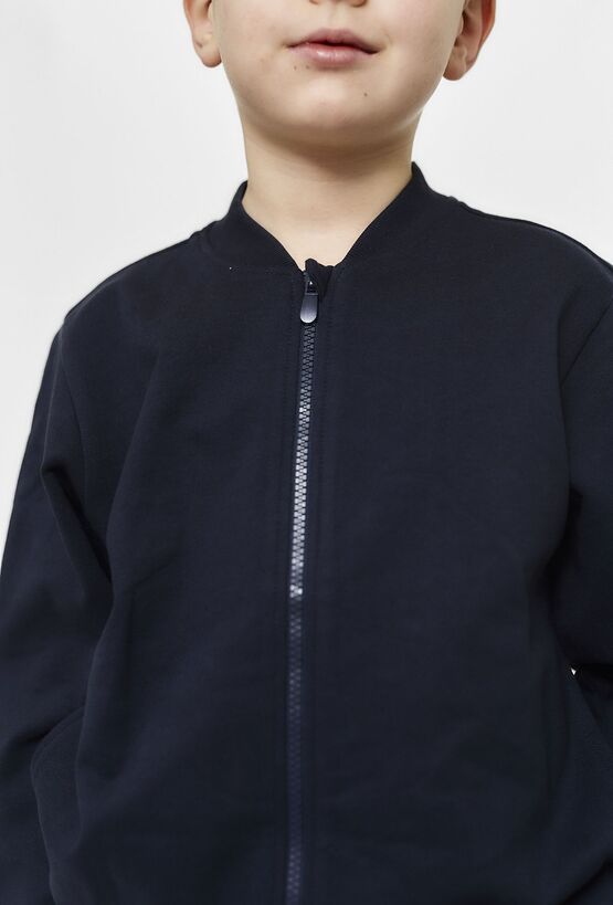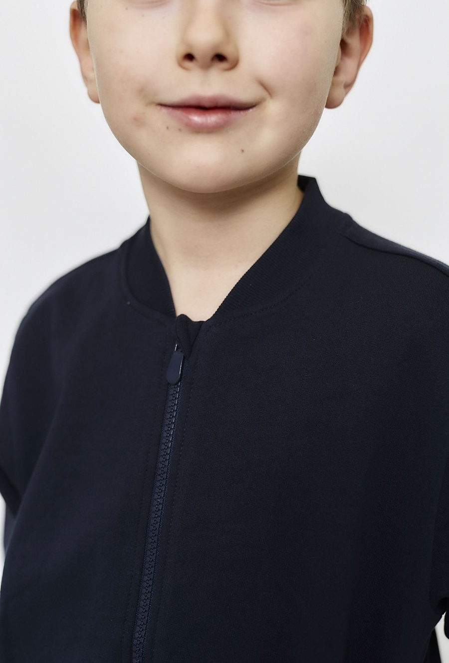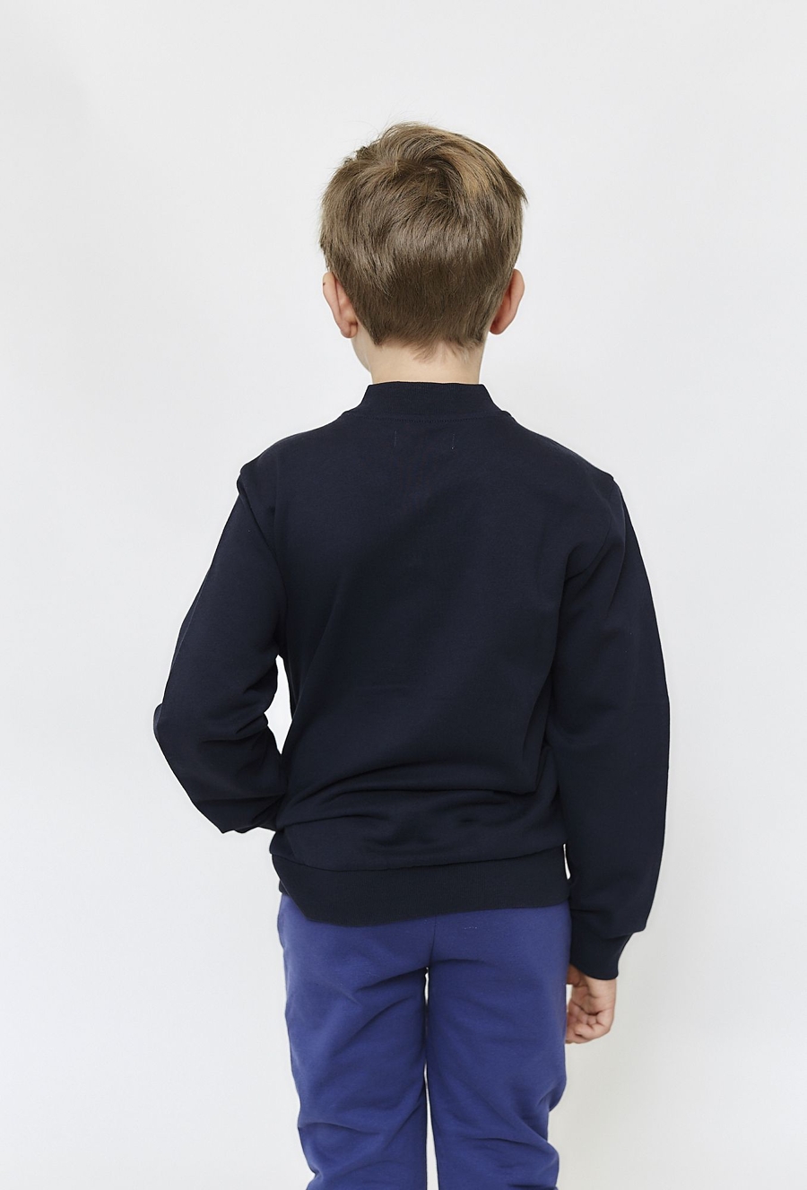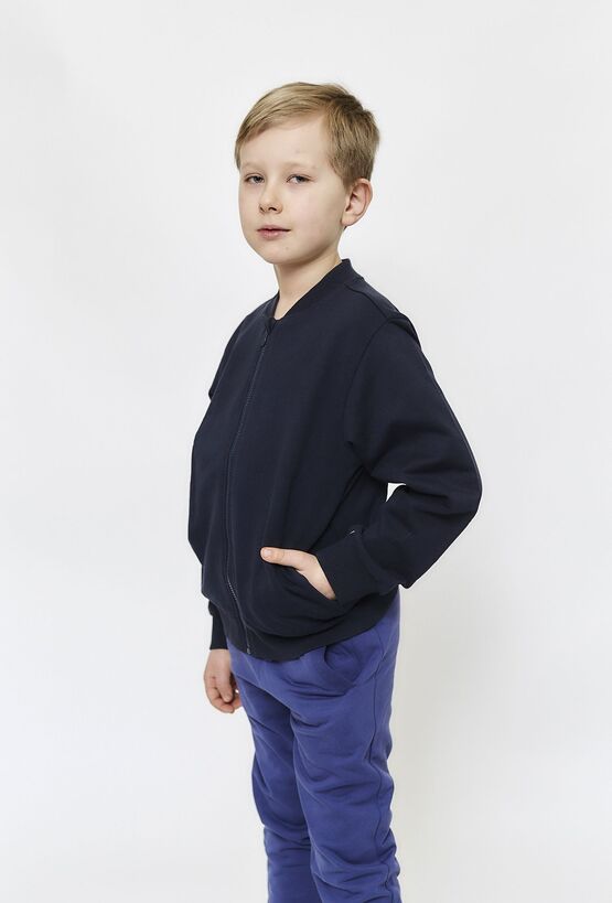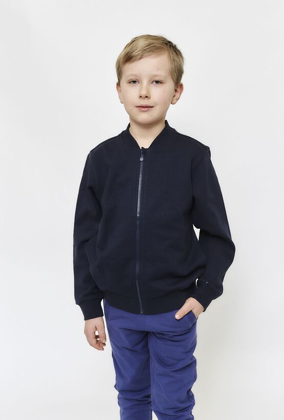 Rozpinana bluza chłopięca w uniwersalnym granatowym kolorze. Model z wygodnym zamkiem na całej długości i wykończeniem w formie stójki. Prosty, klasyczny krój sprawdzi się w wielu codziennych zestawach – zarówno do szkoły, jak i na spacer. Elastyczne ściągacze przy rękawach i u dołu bluzy dbają o dobre dopasowanie i komfort noszenia. Świetna jako samodzielna warstwa lub pod kurtkę w chłodniejsze dni.