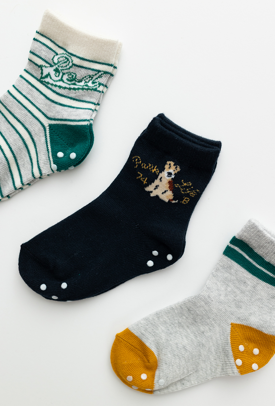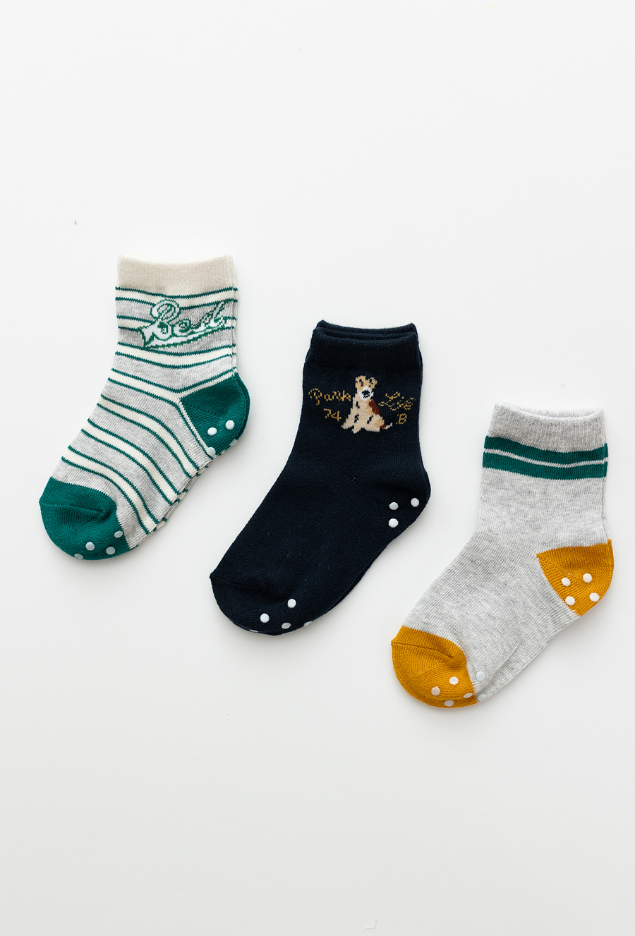 Zestaw 3 par chłopięcych skarpet z systemem ABS, który zapobiega ślizganiu się na gładkich powierzchniach. Wykonane z wysokiej jakości bawełny (80%) z domieszką poliamidu i elastanu, gwarantują komfort noszenia i trwałość. Różnorodne wzory – paski, piesek oraz klasyczne połączenia kolorów – sprawiają, że będą idealnym uzupełnieniem garderoby malucha. Świetne do codziennego noszenia w domu, przedszkolu czy na wyjścia.