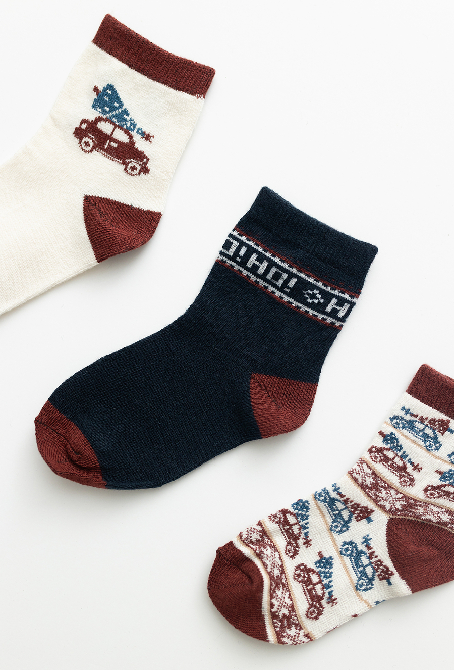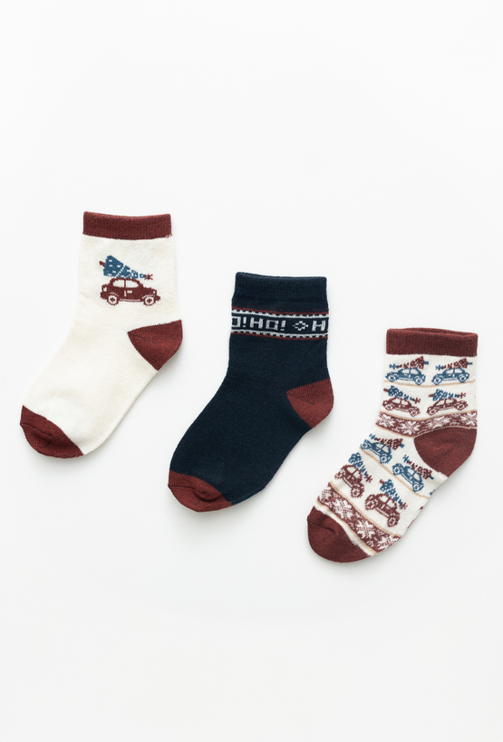 Skarpety dziecięce 3-pak – świąteczne wzory z autkami.