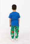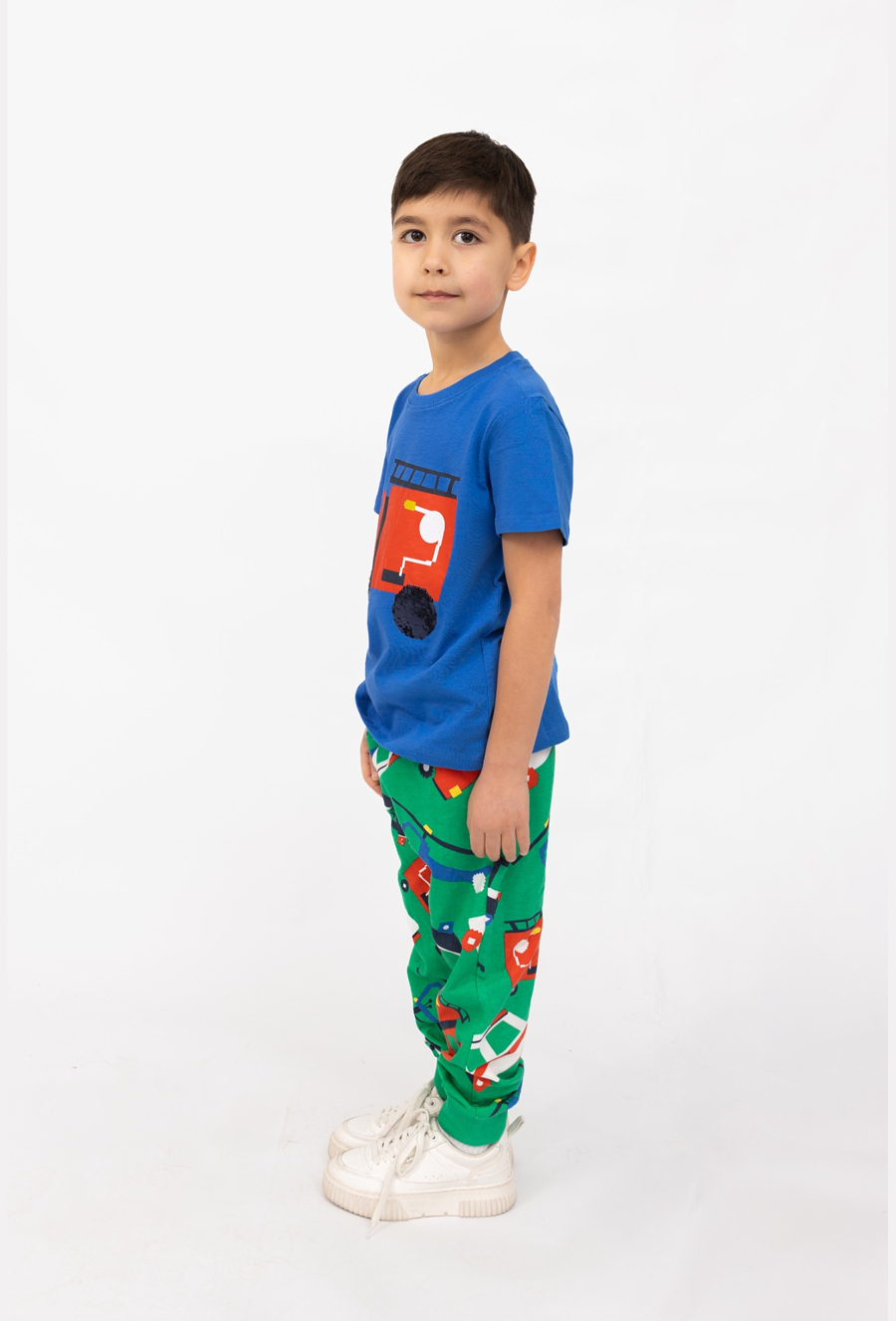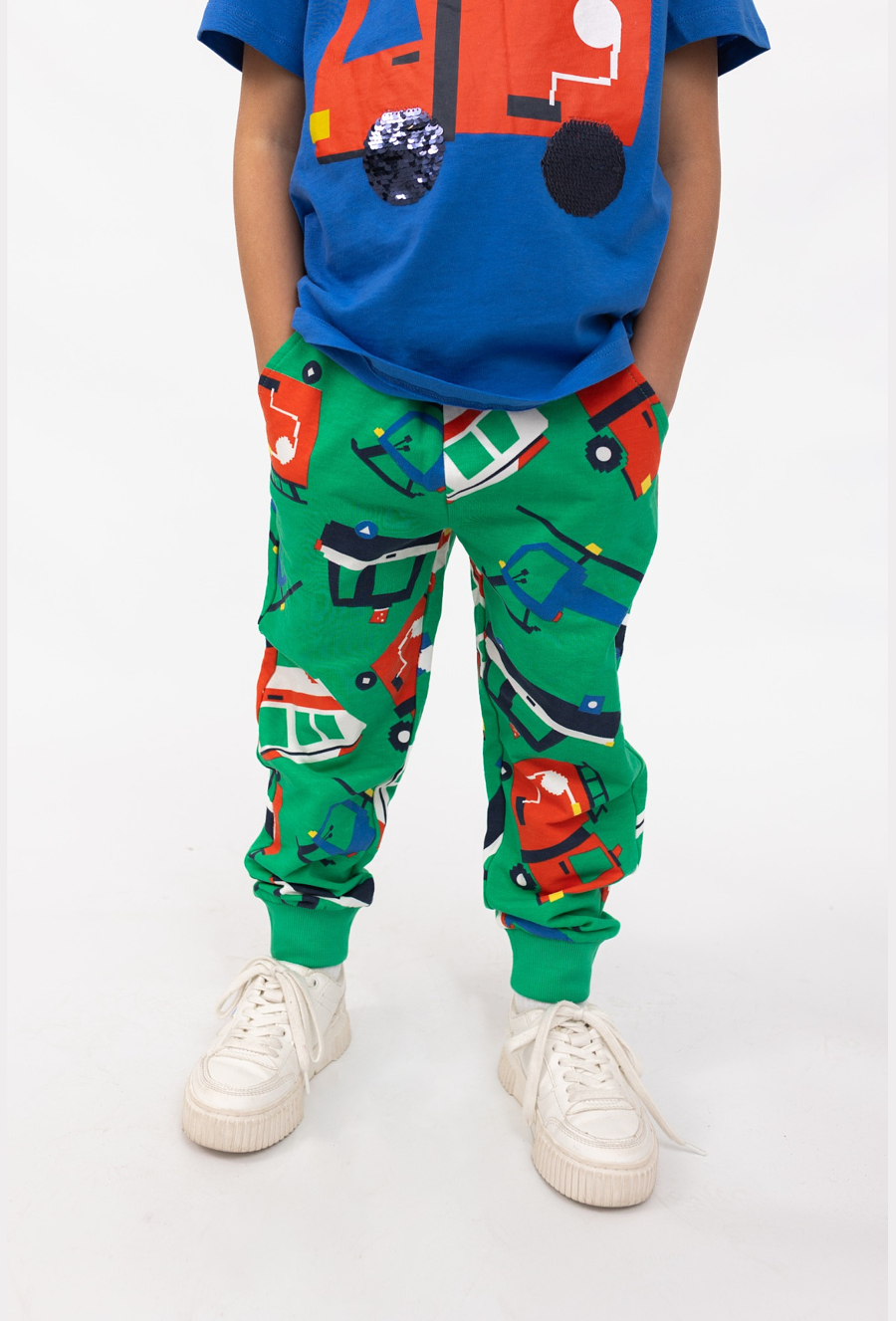 Zielone spodnie dresowe chłopięce z nadrukiem w autka to wygodna baza na każdy dzień – do domu, przedszkola, szkoły i na plac zabaw. Kolorowy print z pojazdami (m.in. straż, helikopter, auta) dodaje energii stylizacji i sprawia, że dzieci je uwielbiają. Spodnie są uszyte z 100% bawełny, mają ściągacze przy nogawkach oraz regulację w pasie sznurkiem, dzięki czemu dobrze leżą i łatwo dopasowują się do sylwetki.