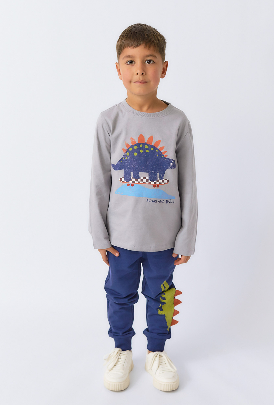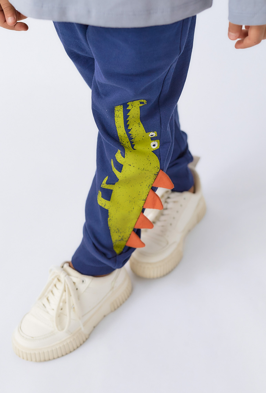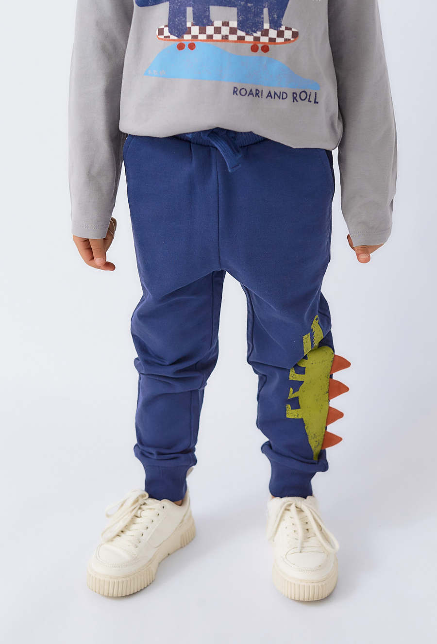 Wyróżnij się stylowością i wygodą! Spodnie dresowe chłopięce z zabawnym motywem dinozaura i trójwymiarowymi kolcami po boku nogawki to prawdziwy hit wśród najmłodszych fanów prehistorycznych gadów. Uszyte z miękkiej, oddychającej bawełny, zapewniają komfort noszenia przez cały dzień. Model posiada elastyczny pas i ściągacze u dołu nogawek, co gwarantuje świetne dopasowanie. Idealne do szkoły, zabawy i spacerów.